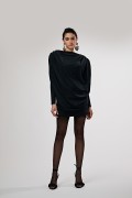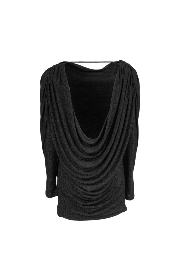 Abito mini tessuto lurex morbido, con ampio drappeggio sul fronte e sul retro lasciando la schiena scoperta, spalle segnate.