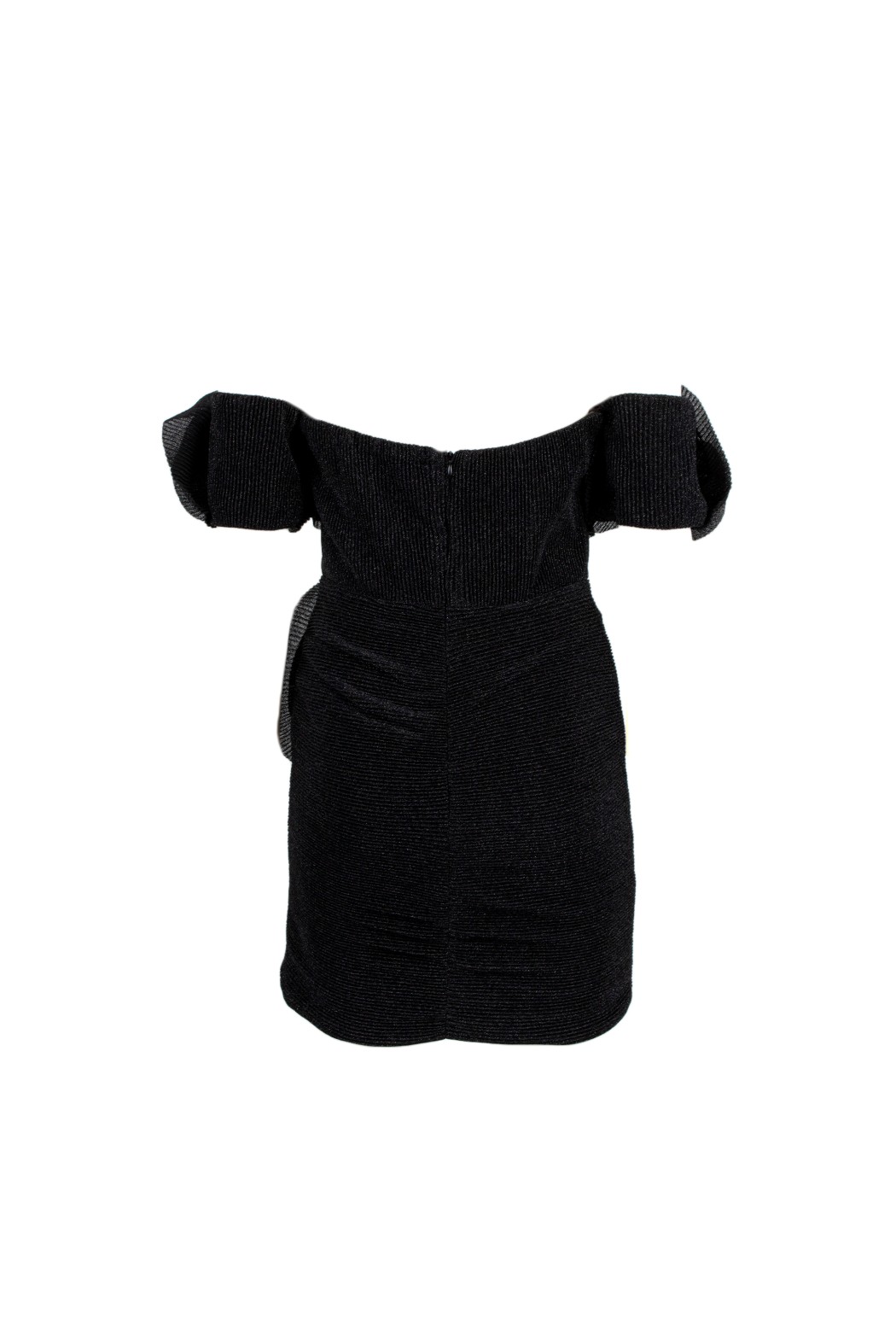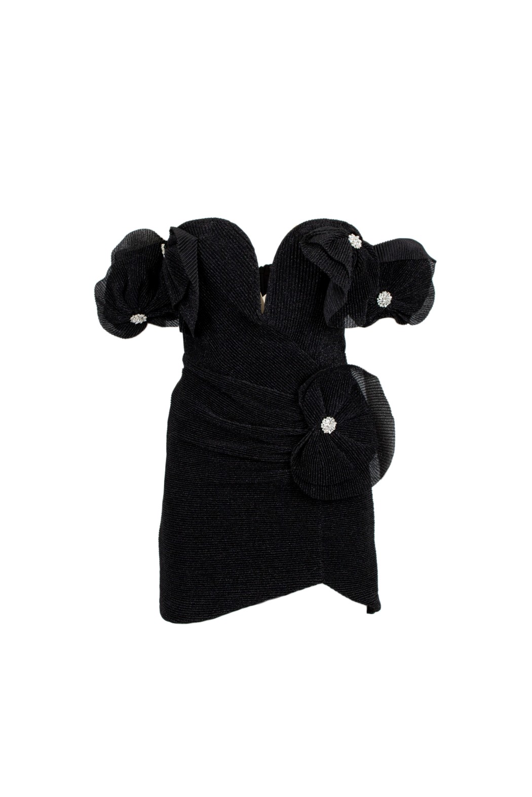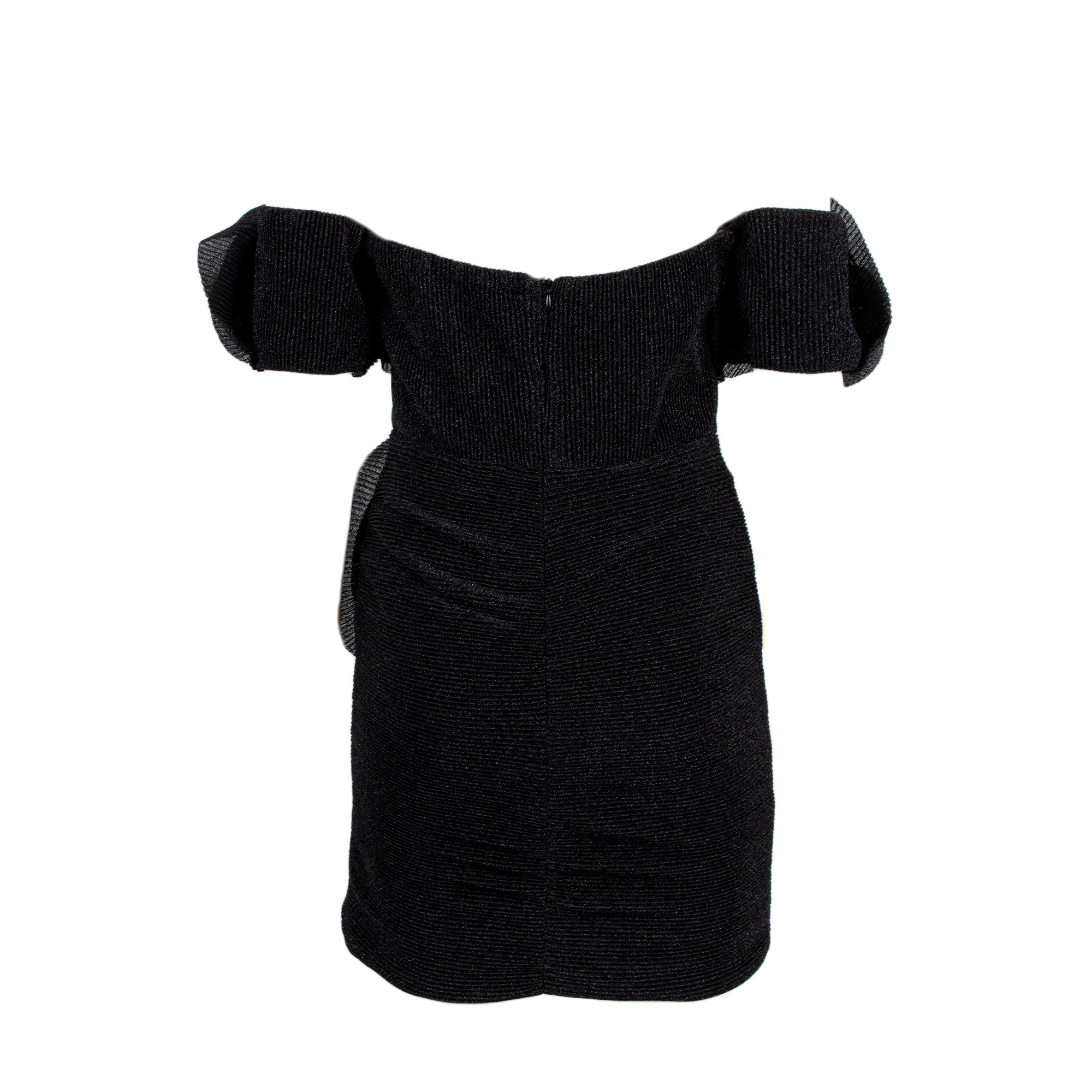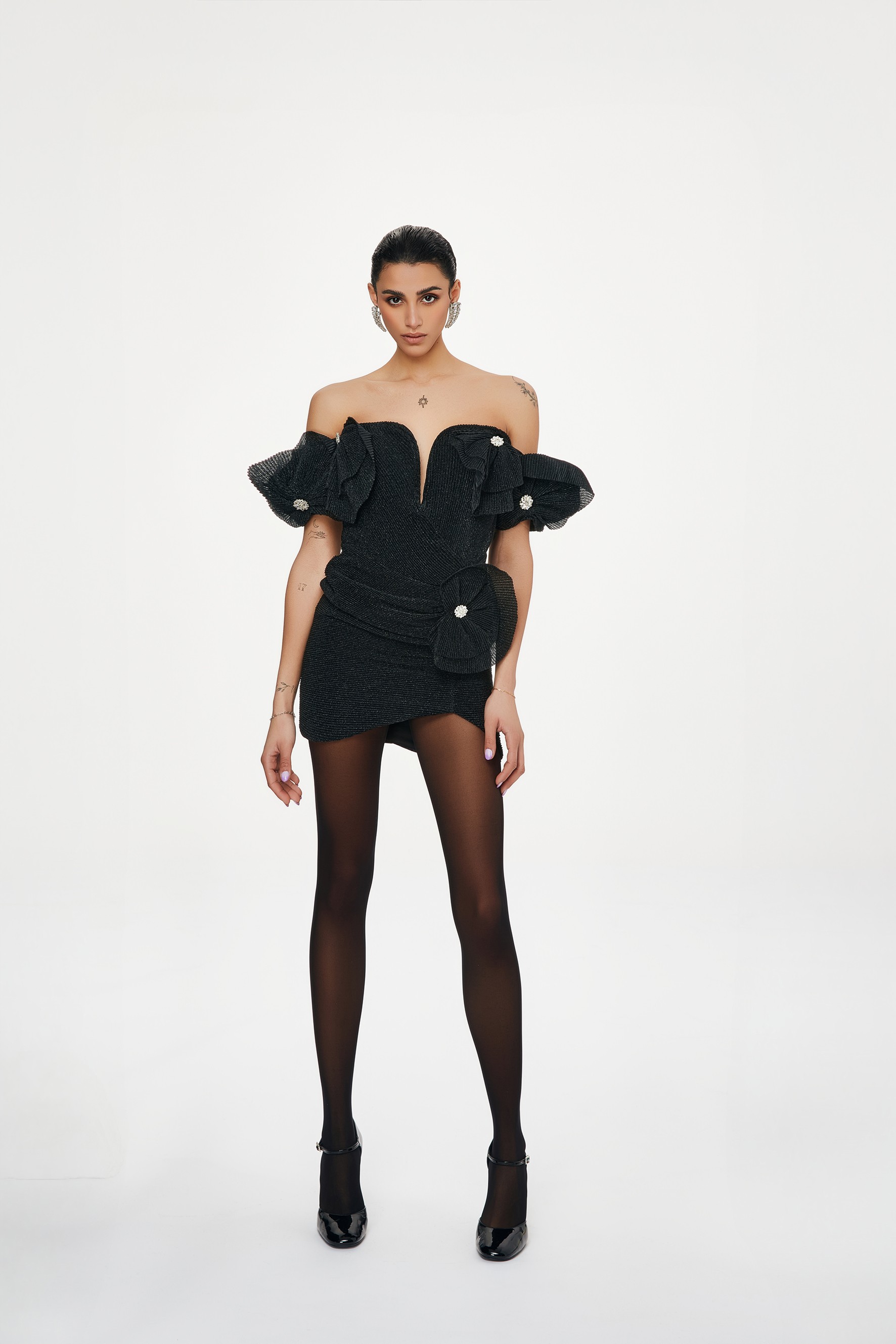 Abito mini asimmetrico in tessuto nero lamé. Modello con scollo a V e drappeggio incrociato in vita. Maniche a palloncino e fiore oversize applicato sul fianco sinistro. Tutte le applicazioni sono decorate con strass.