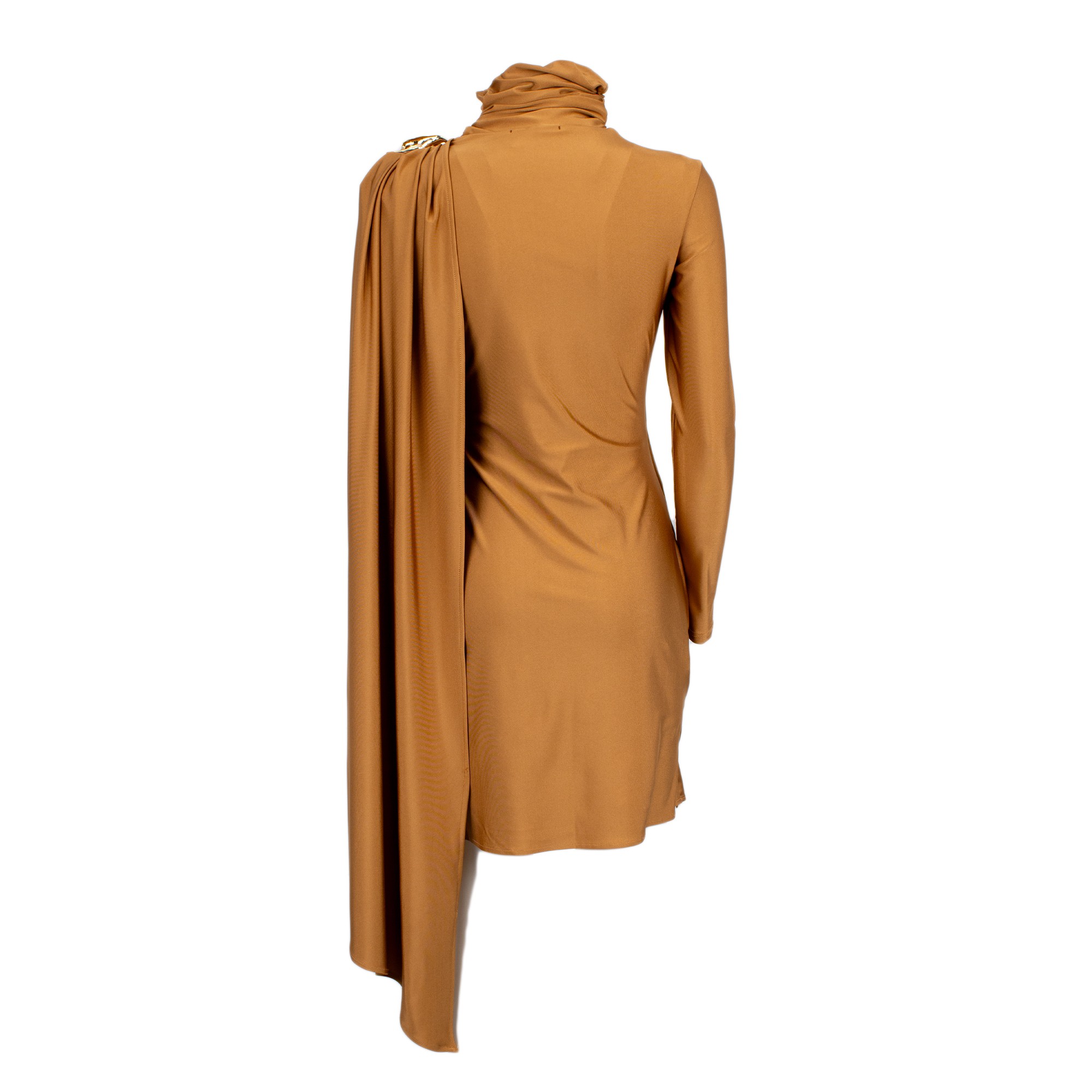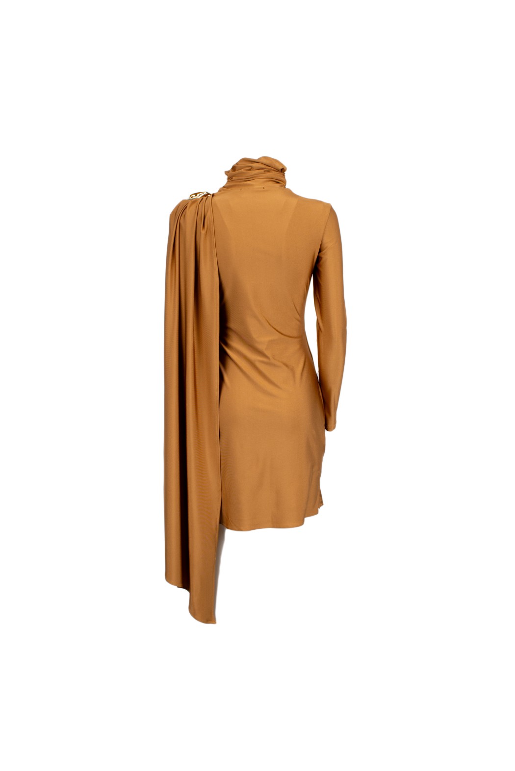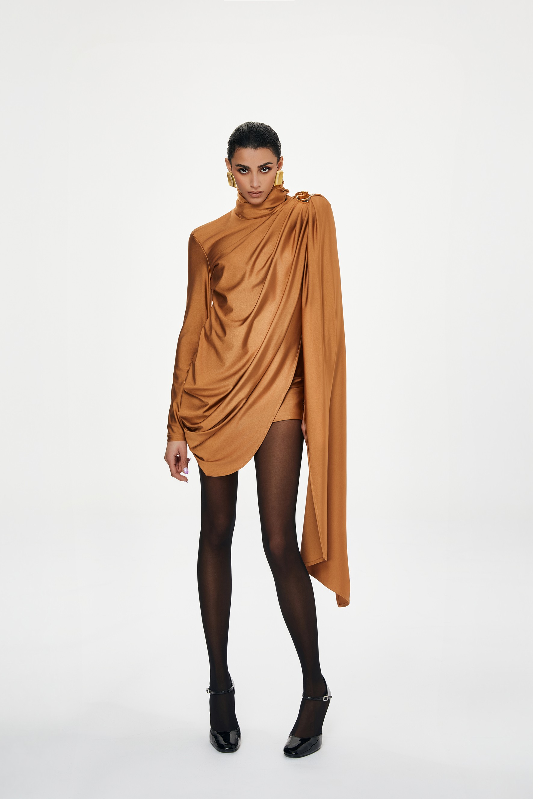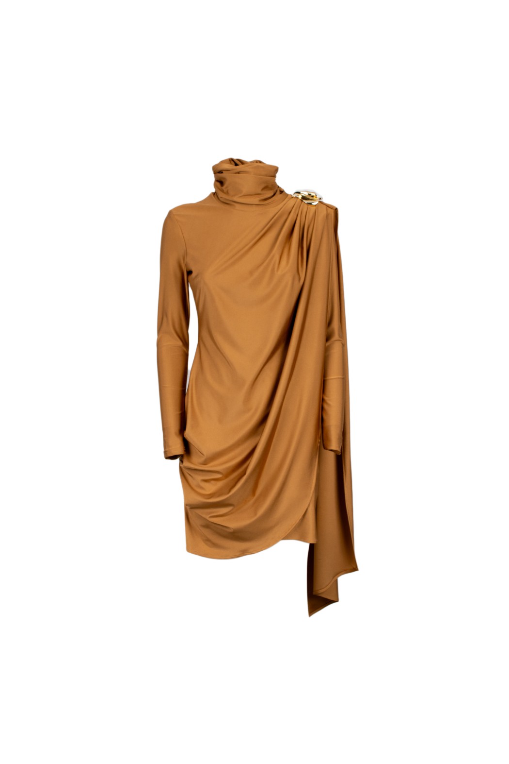 Abito mini drappeggiato. Modello a maniche lunghe con collo alto. Drappeggio asimmetrico che parte dalla spalla destra e scende sul davanti. Spalla destra decorata con un'applicazione in metallo dorato.