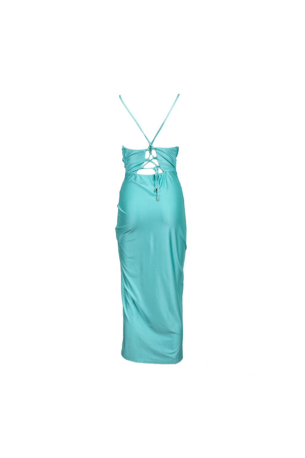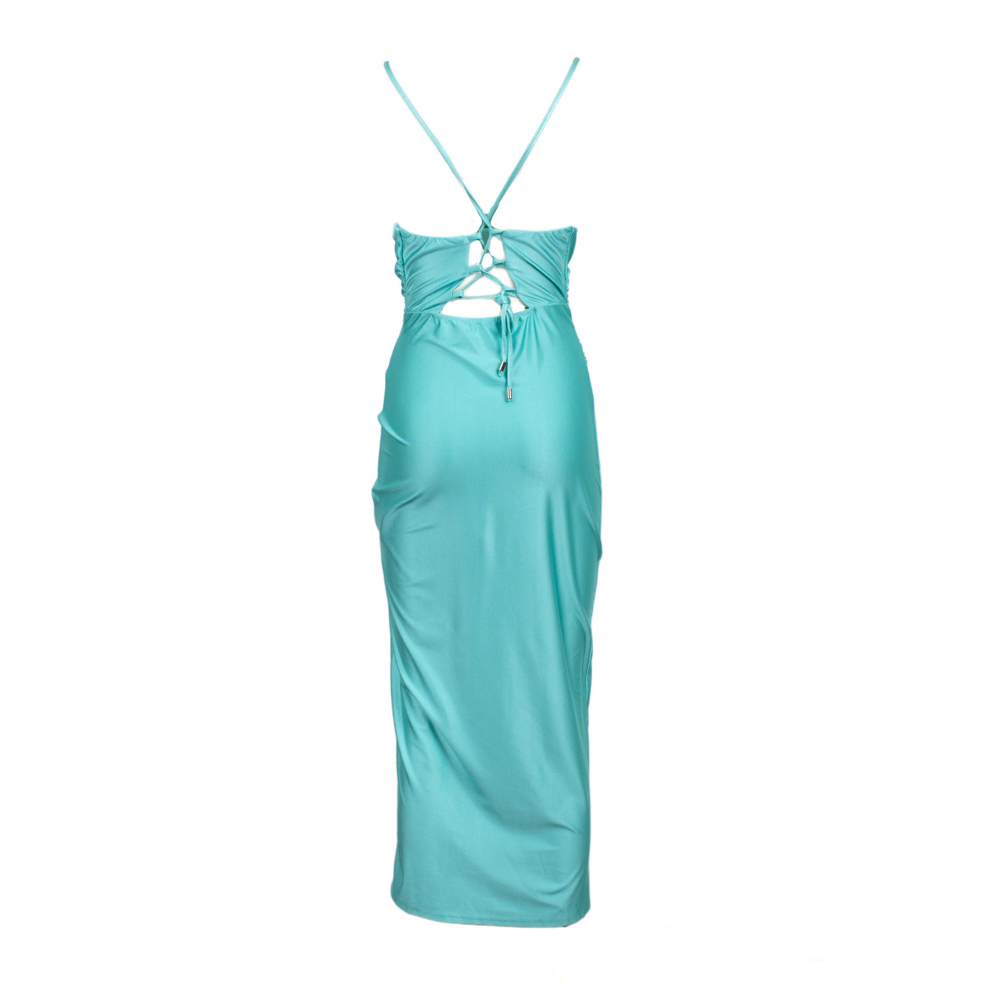 Abito lungo con bretelle, drappeggio in vita spacco laterale , allacciato sulla schiena.