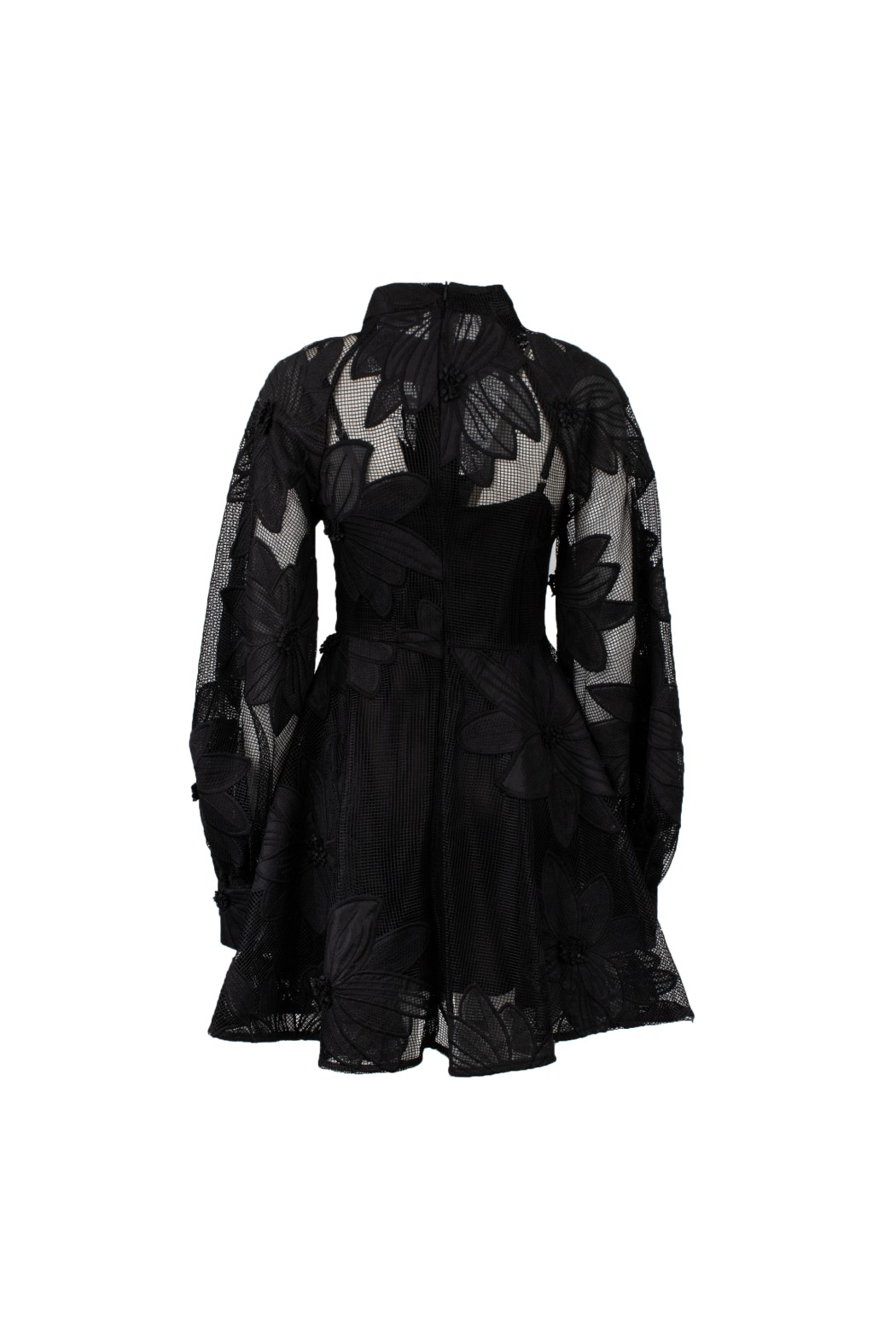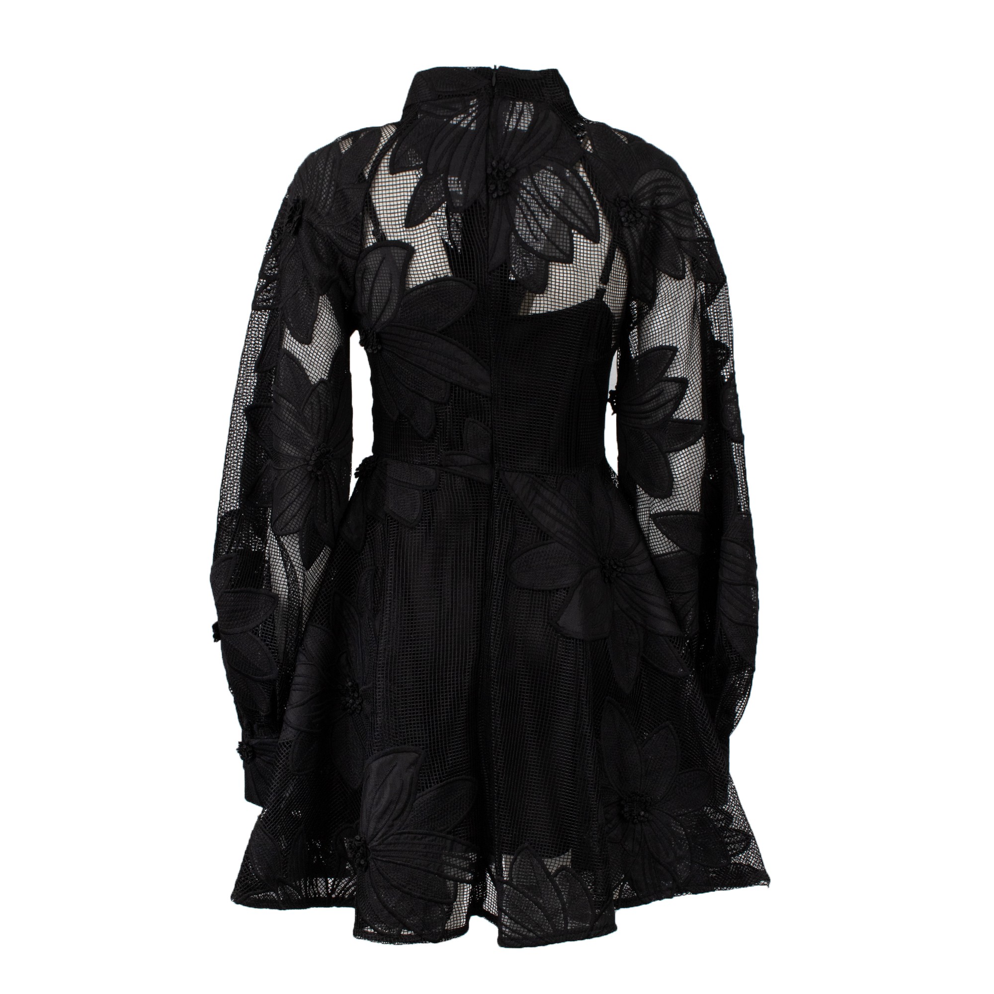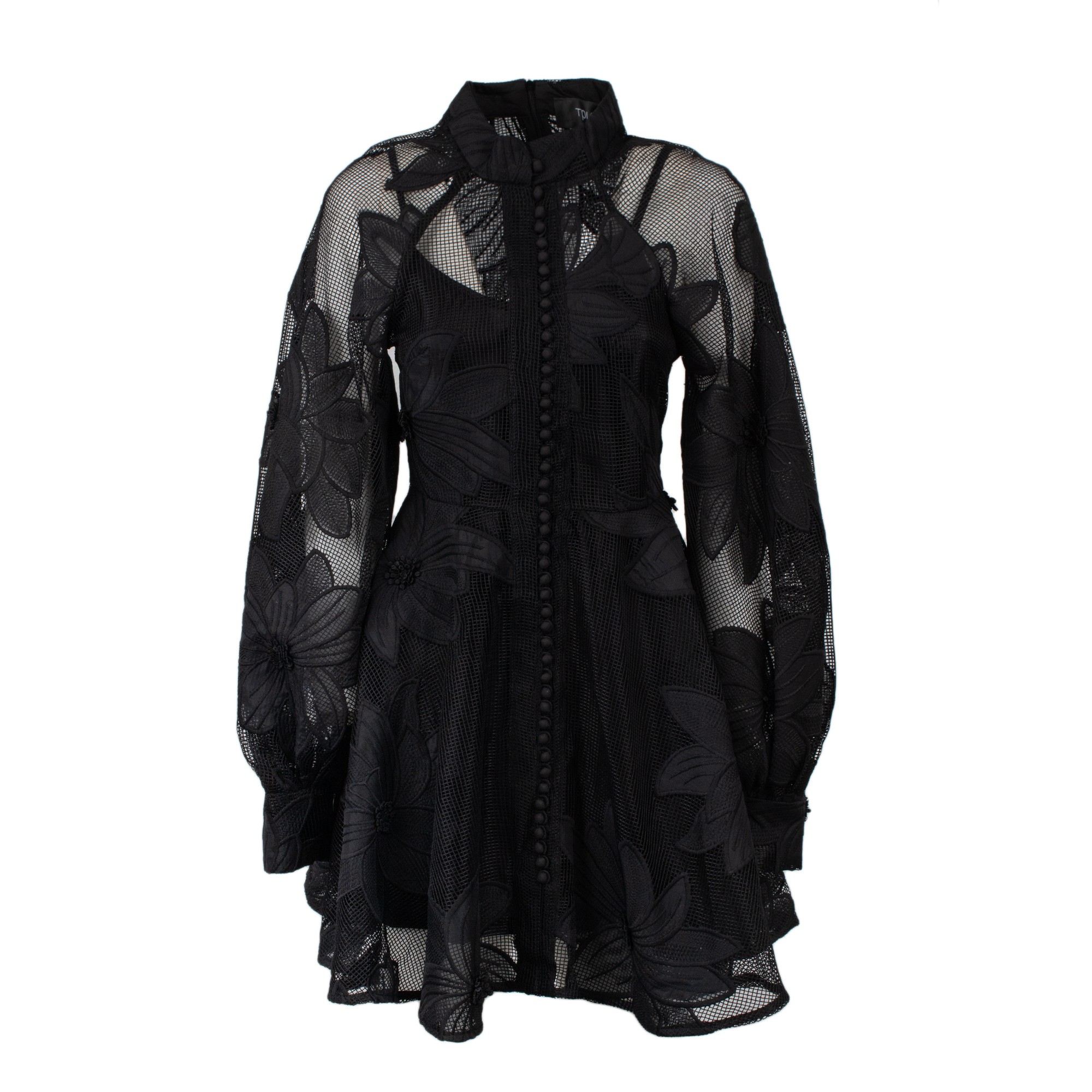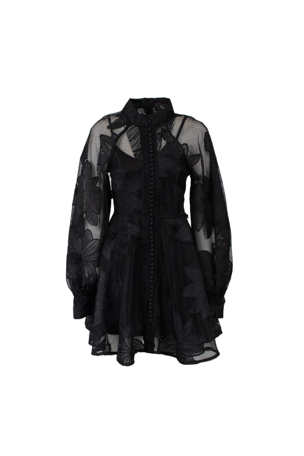 Abito mini tessuto ricamato a con grandi fiori, collo alto maniche ampie a palloncino, chiusura bottoni a colore.