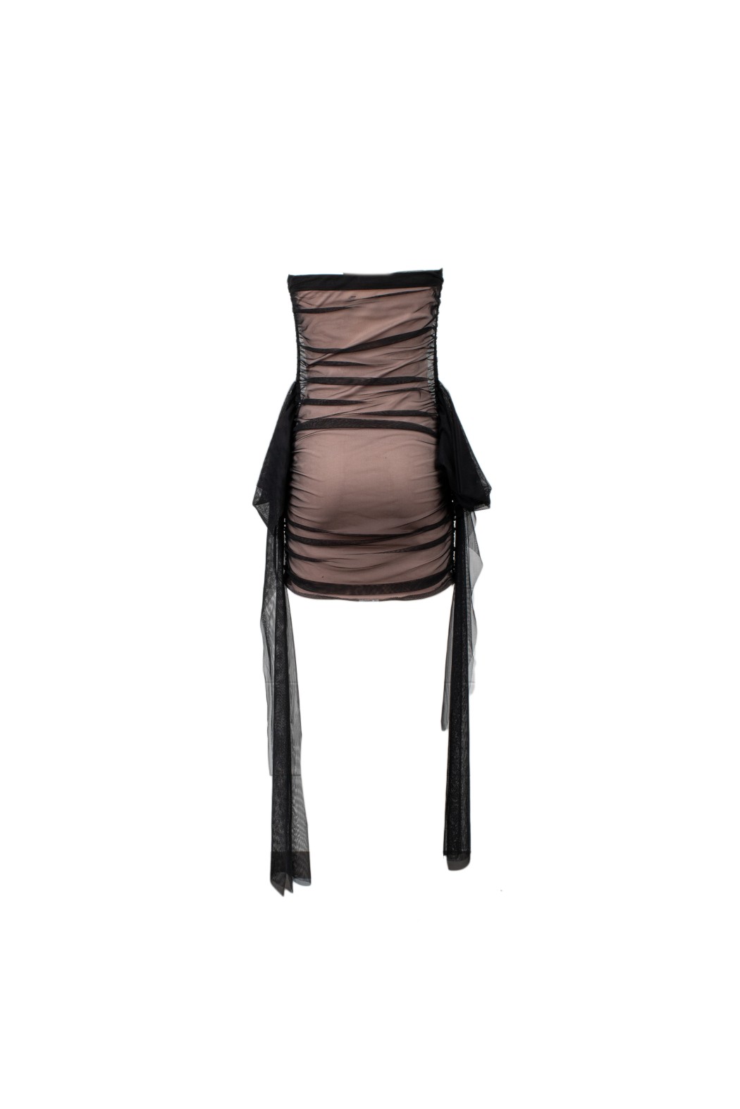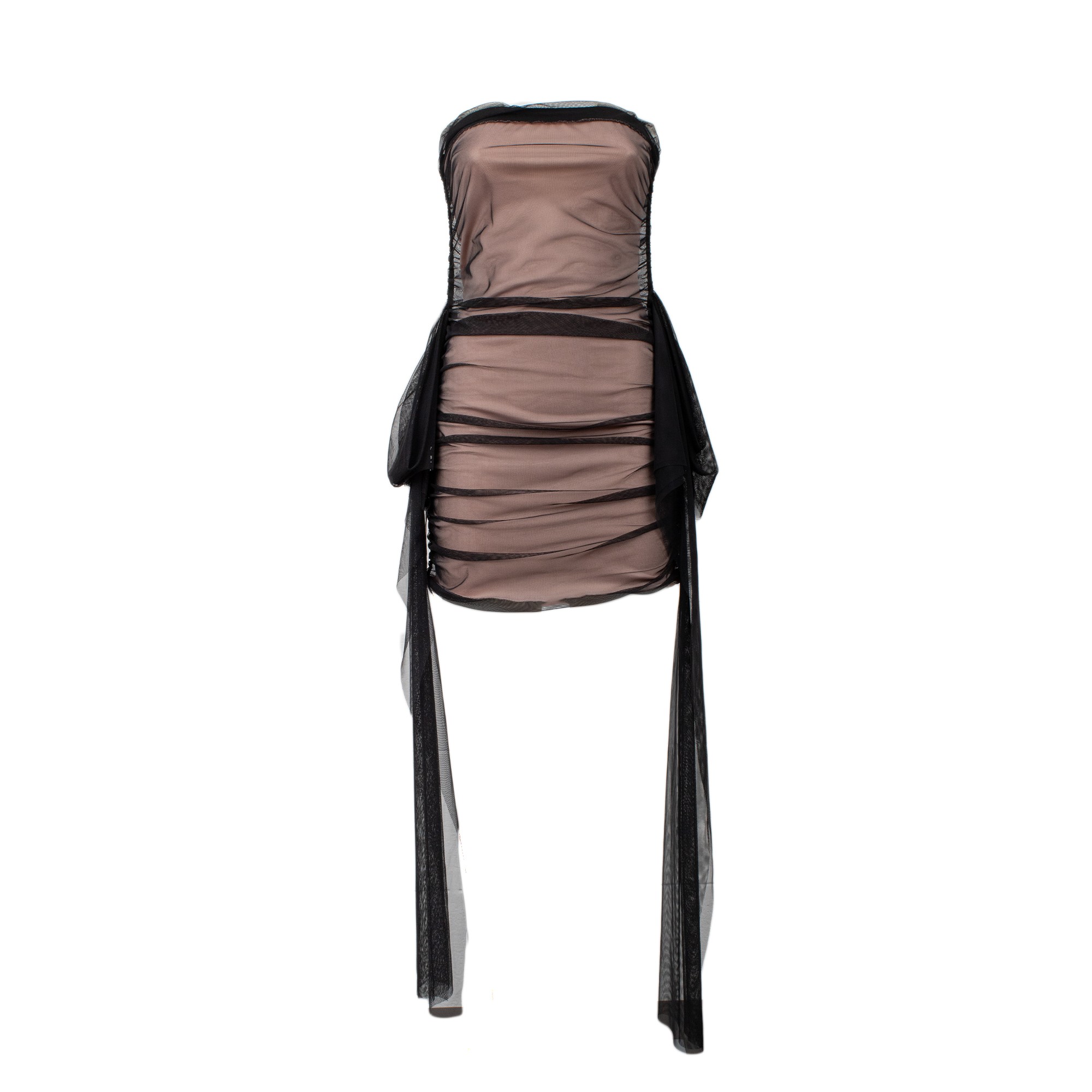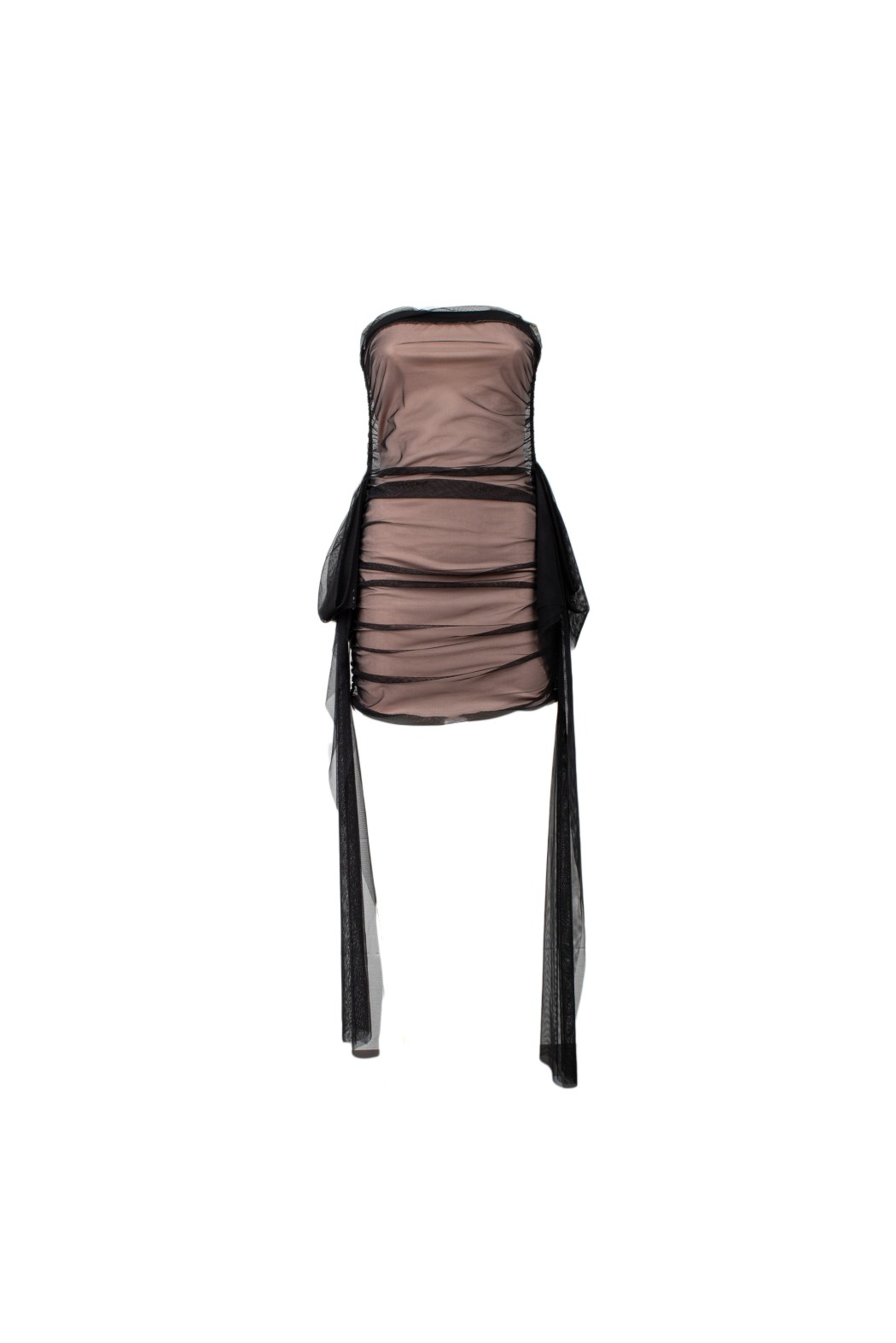 Abito mini in tessuto con tulle sovrapposto, drappeggiato e voulant laterali.