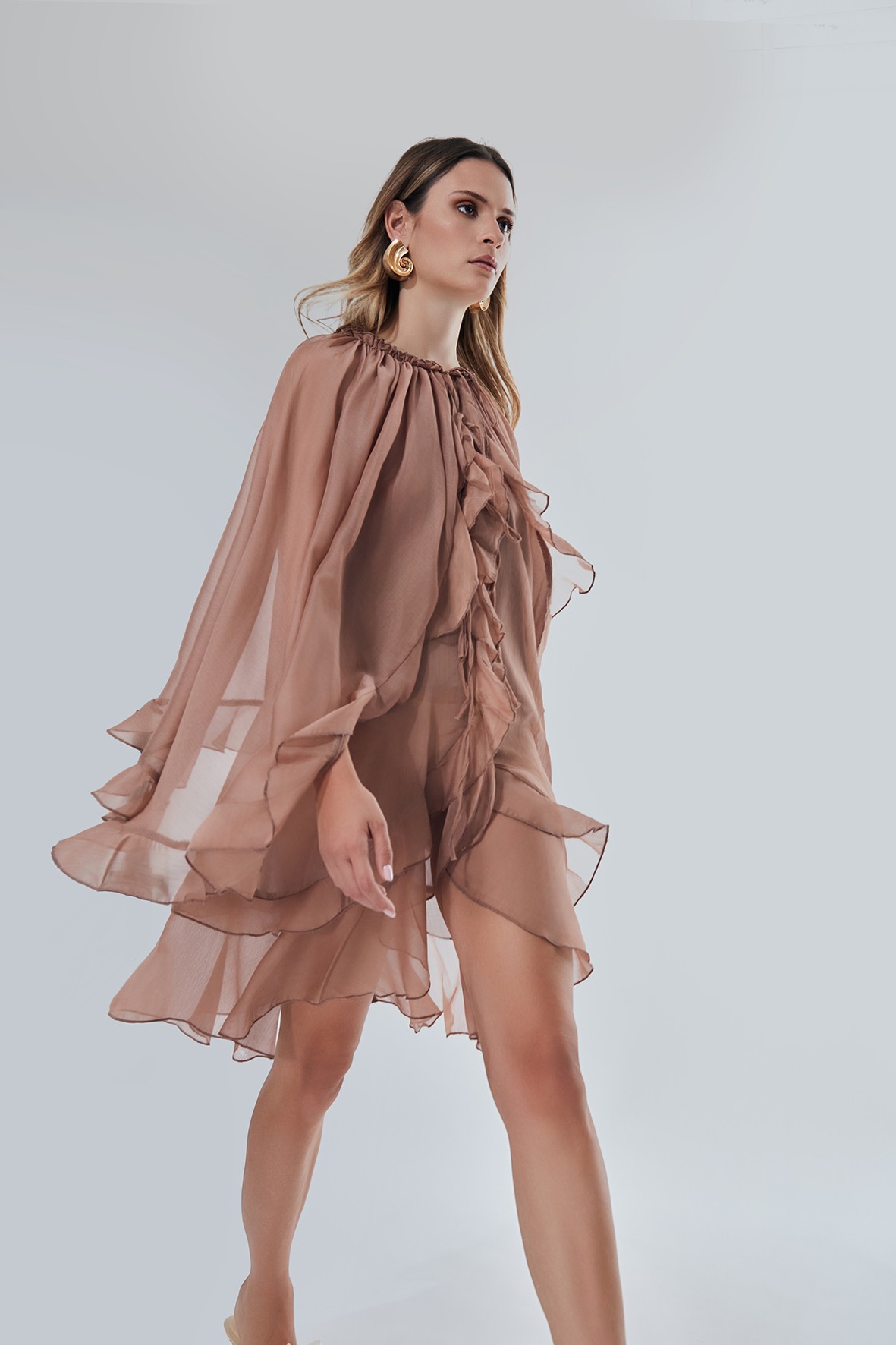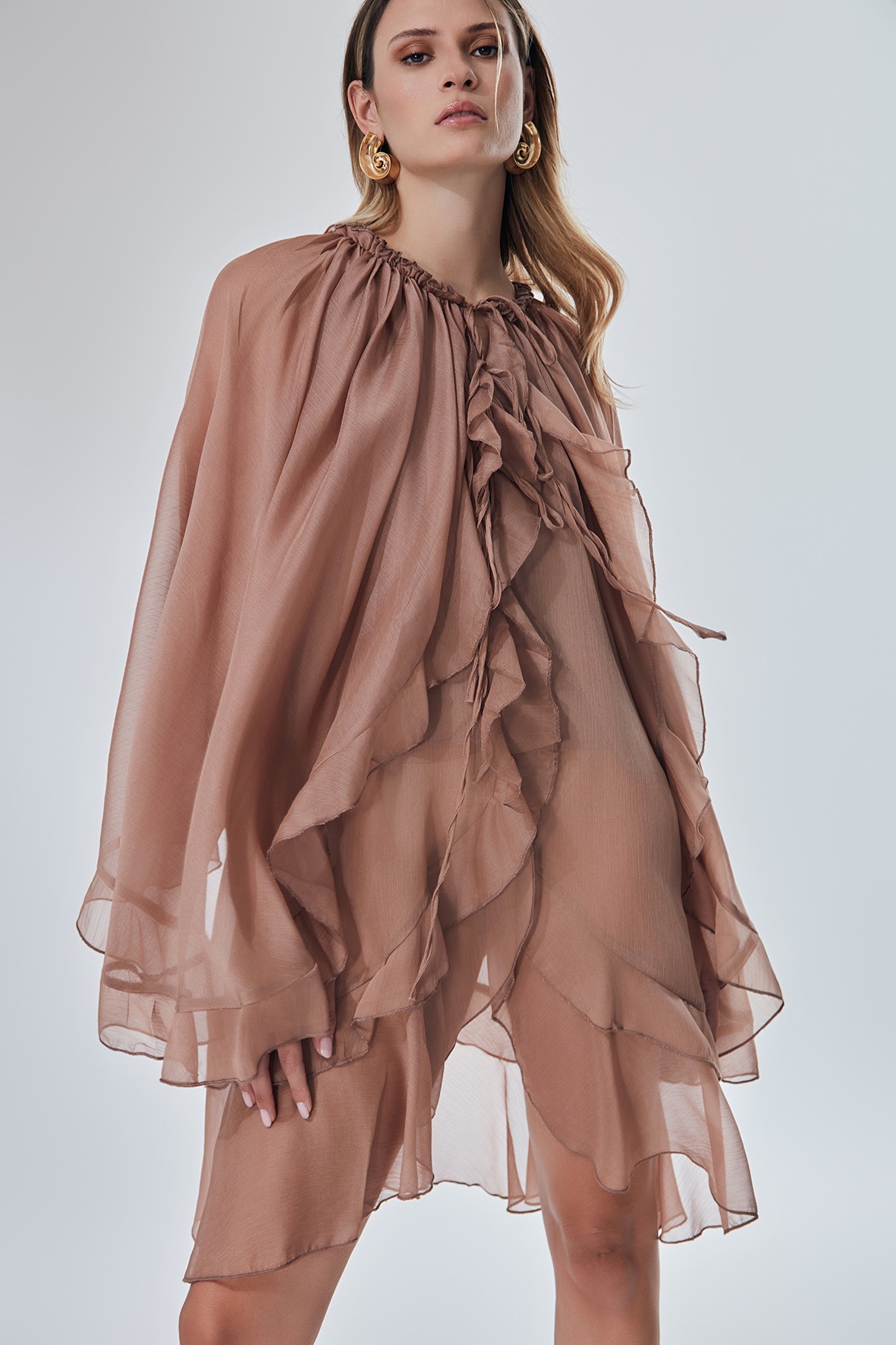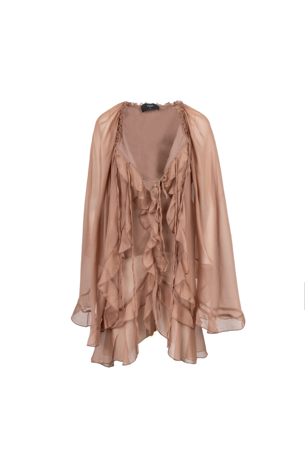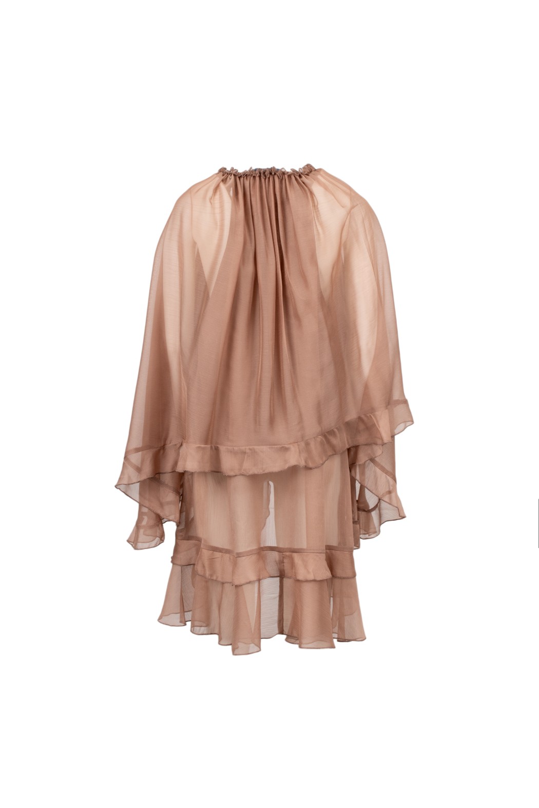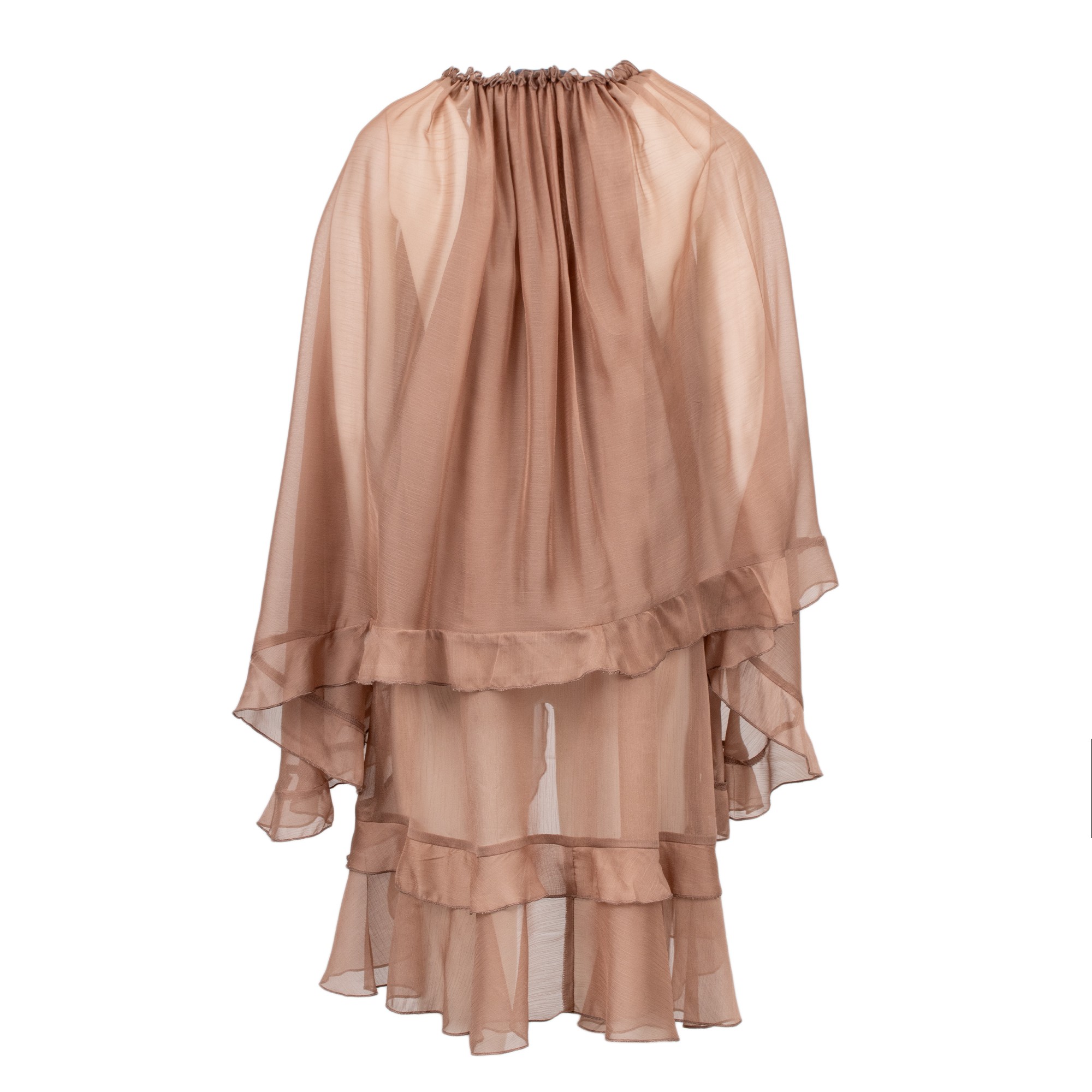 Abito ampio con scollo profondo, il lo scollo si può legare grandi rouche sul fronte e voulant sul retro con maniche larghe.