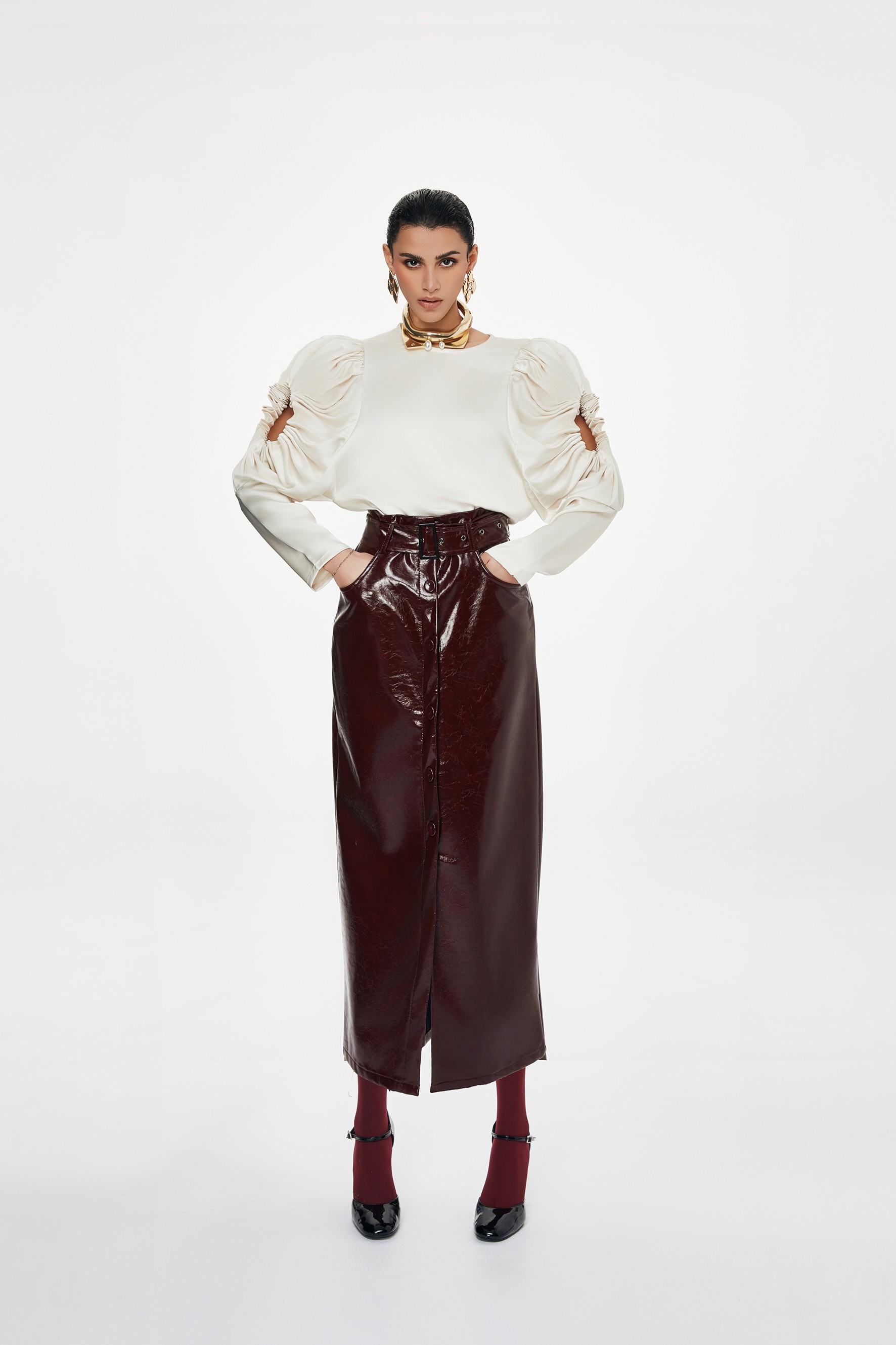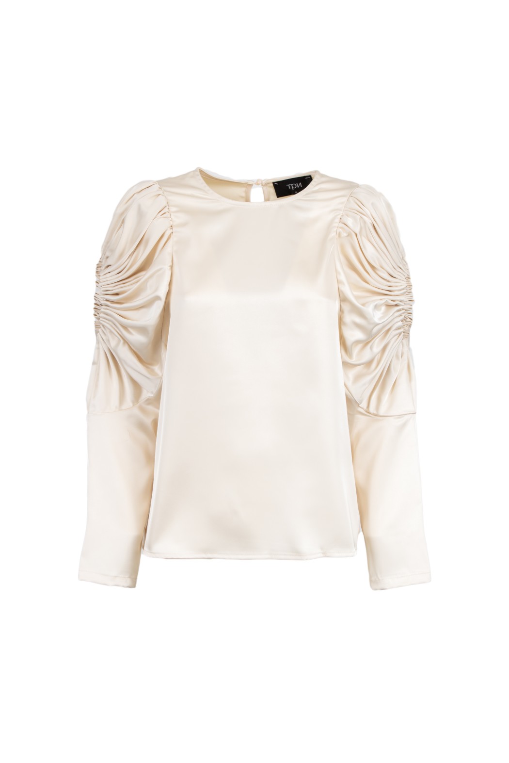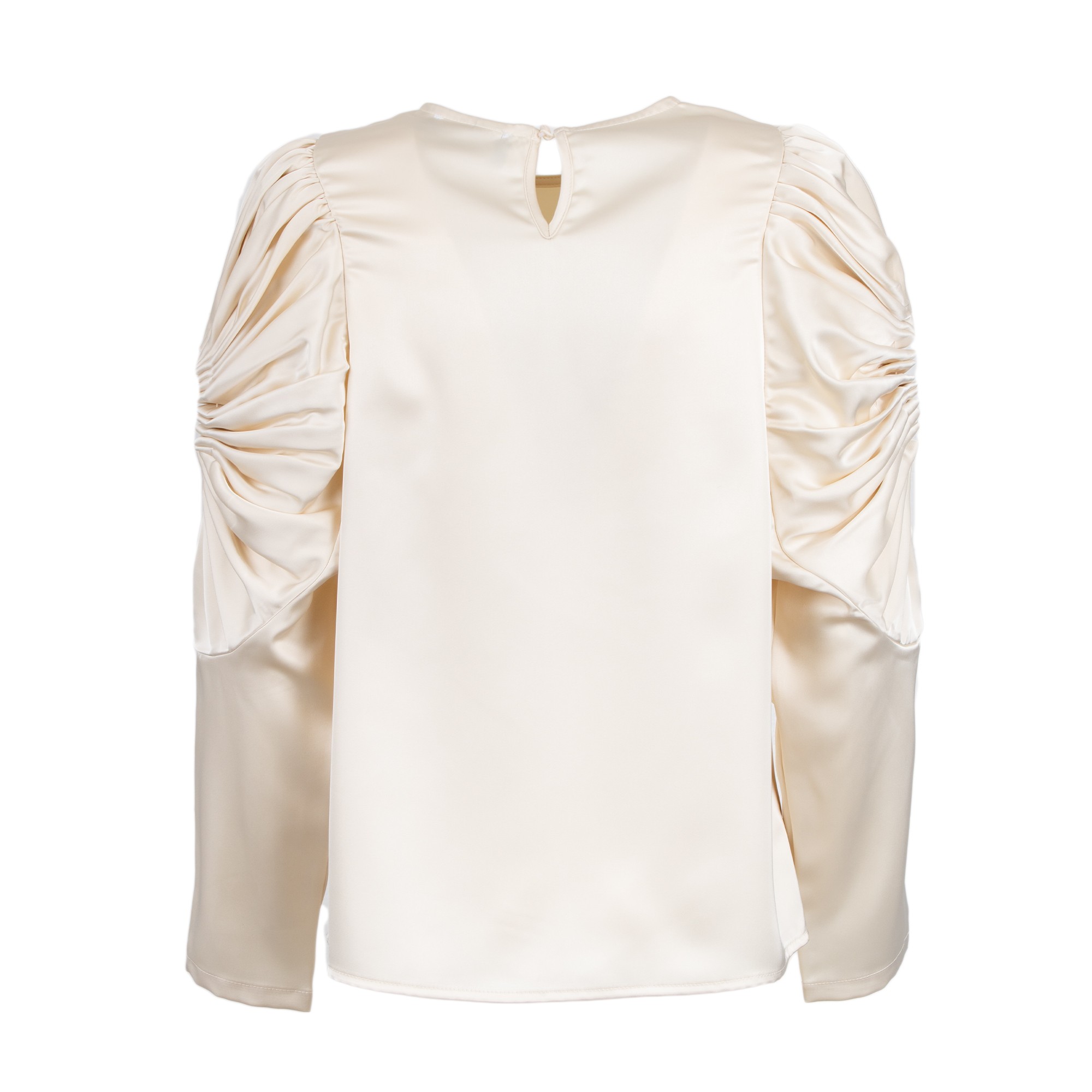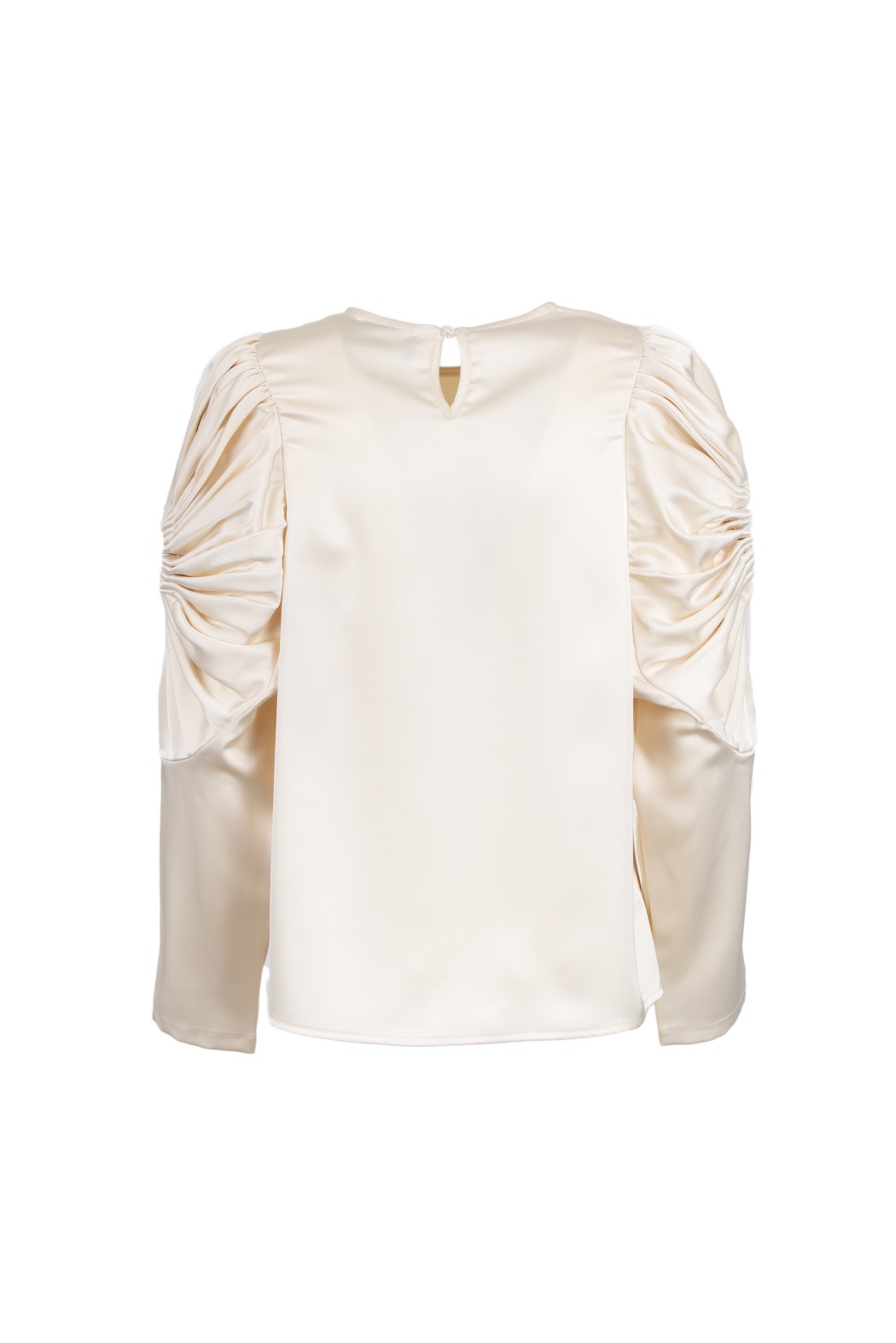 Blusa in raso a maniche lunghe. Scollo rotondo. Dettaglio di arricciatura sulle spalle e sui polsini.