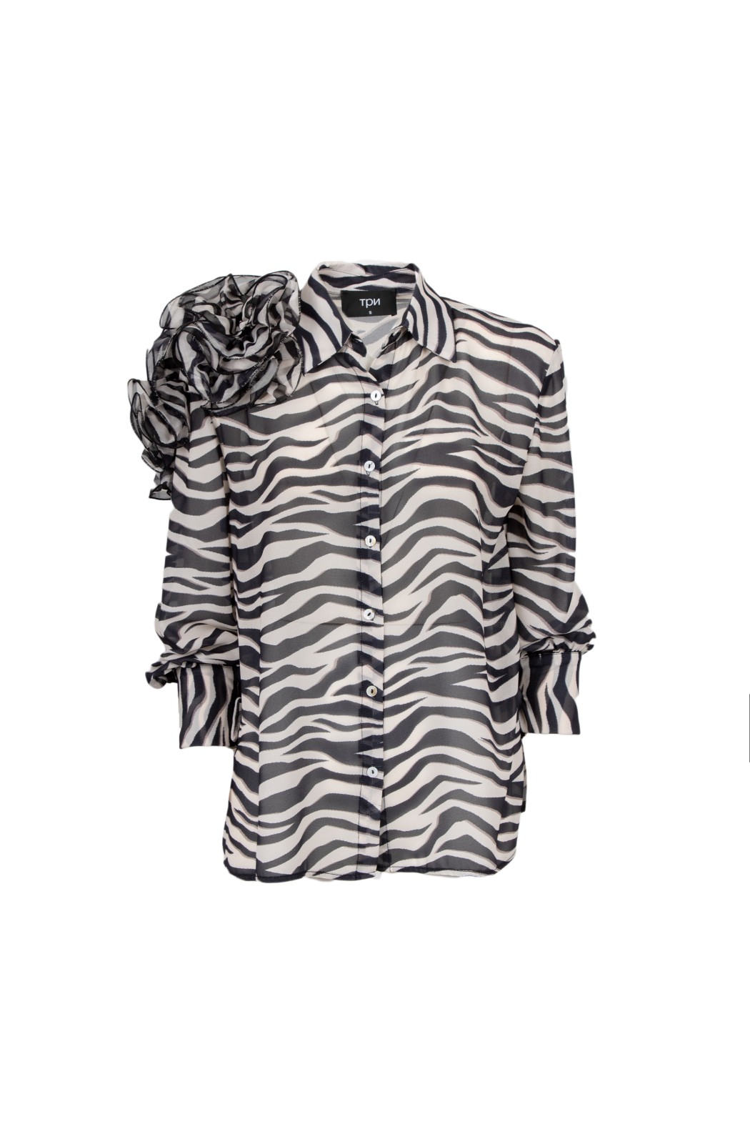 Camicia stampa fantasia collo classico, grande rouches su spalla, maniche ampie.