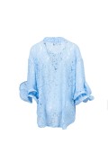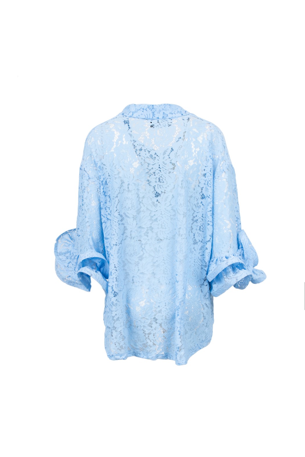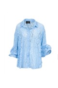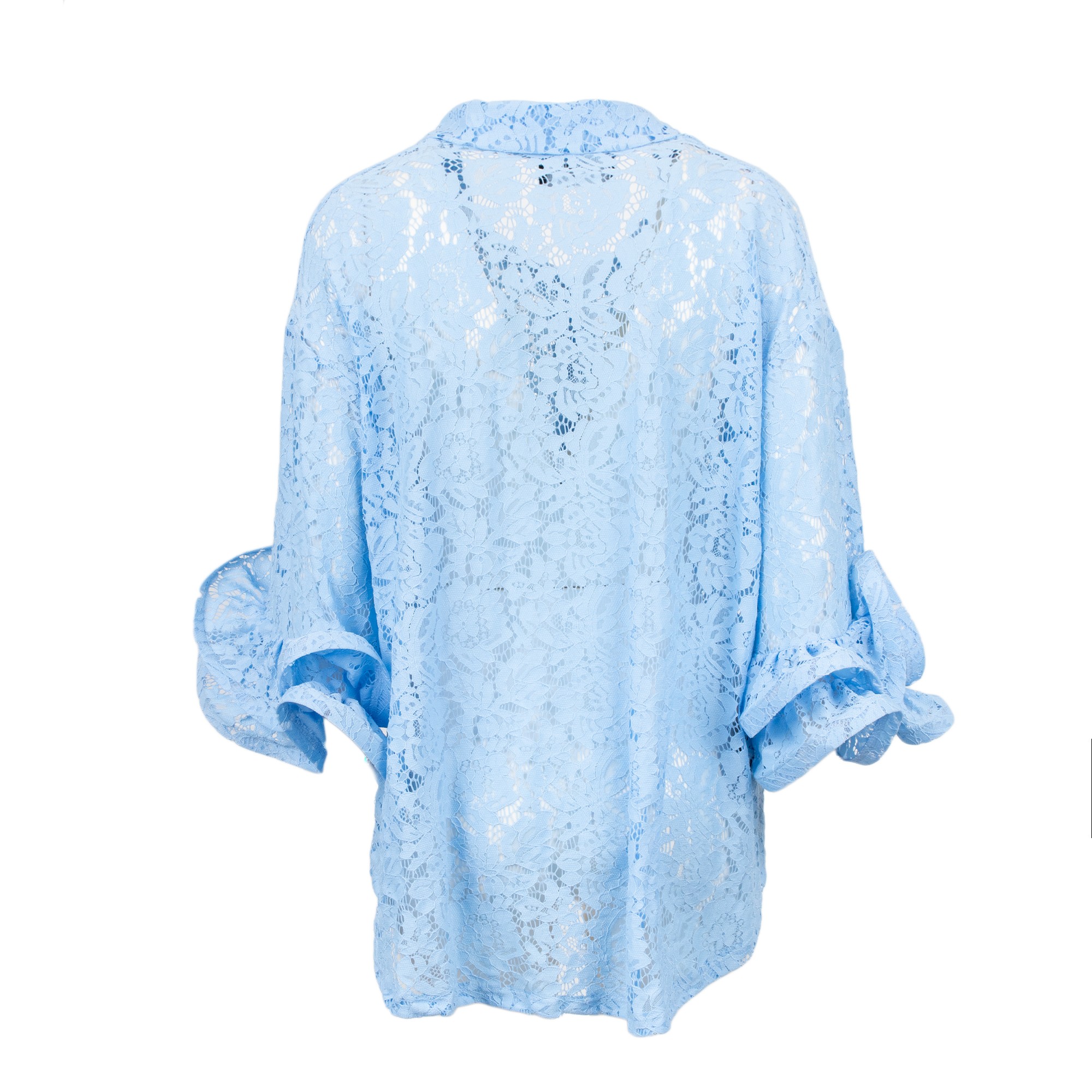 Camicia colletto classico in pizzo con ampie rouches ai polsini, chiusura bottoni.