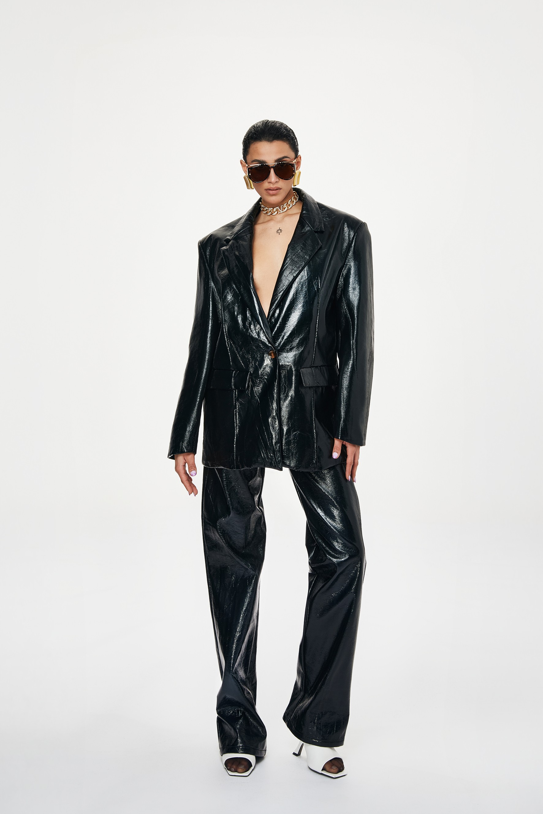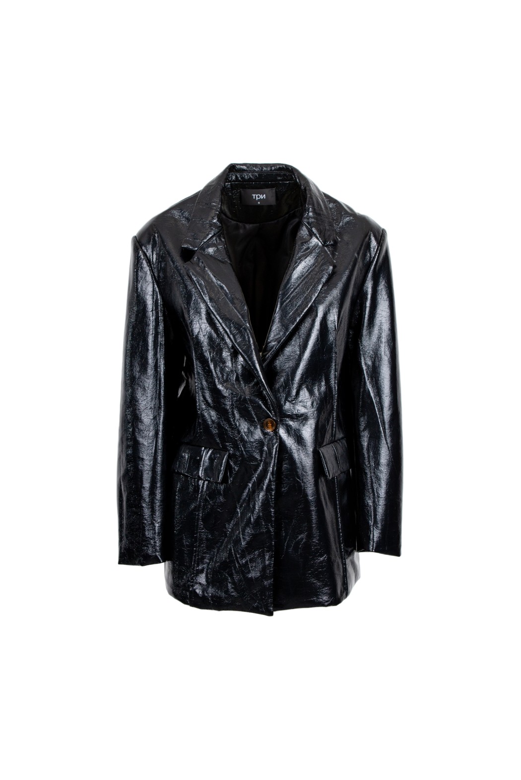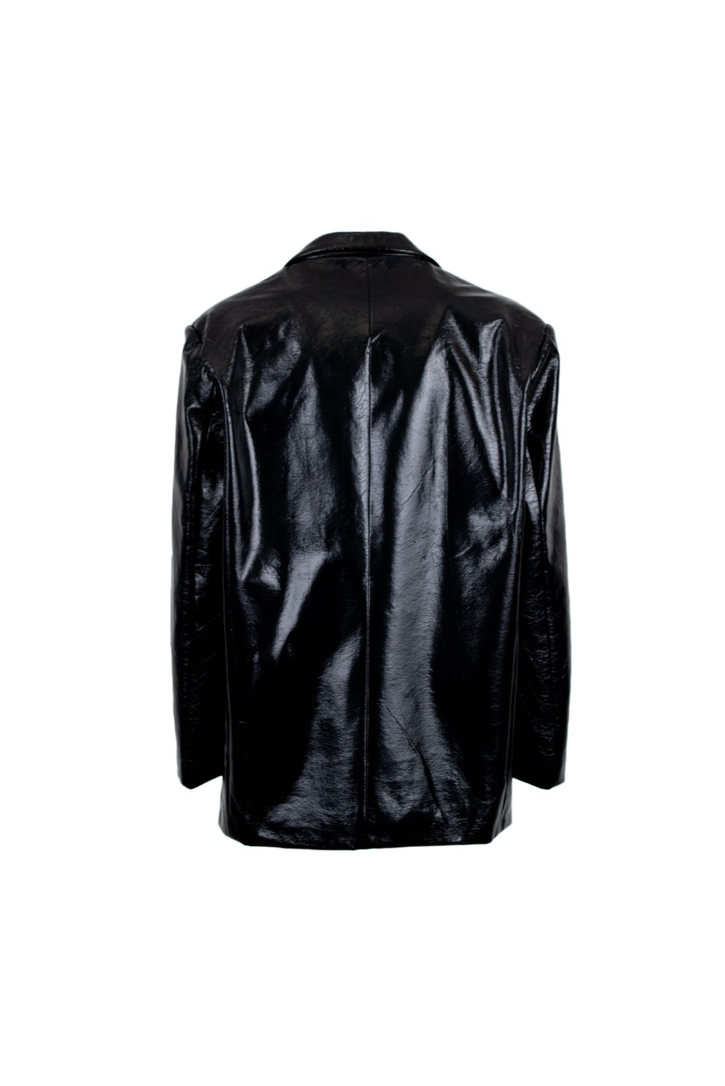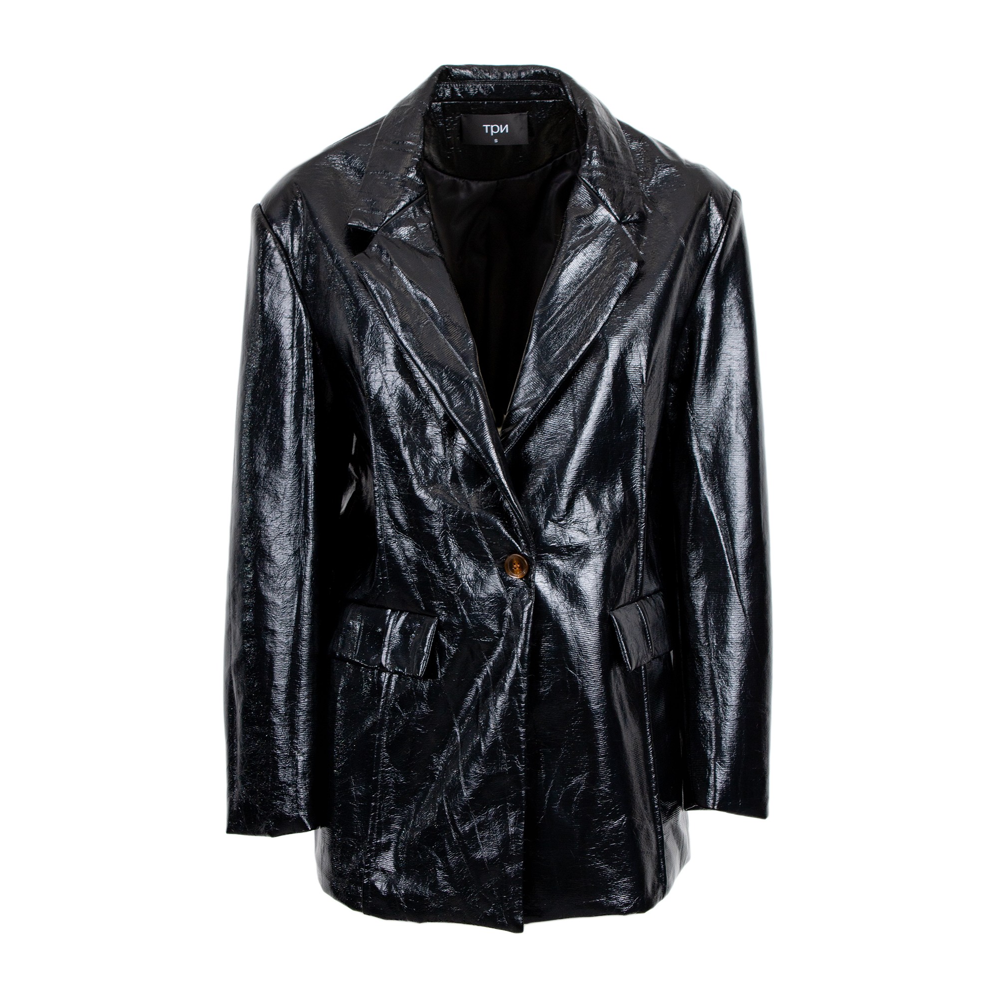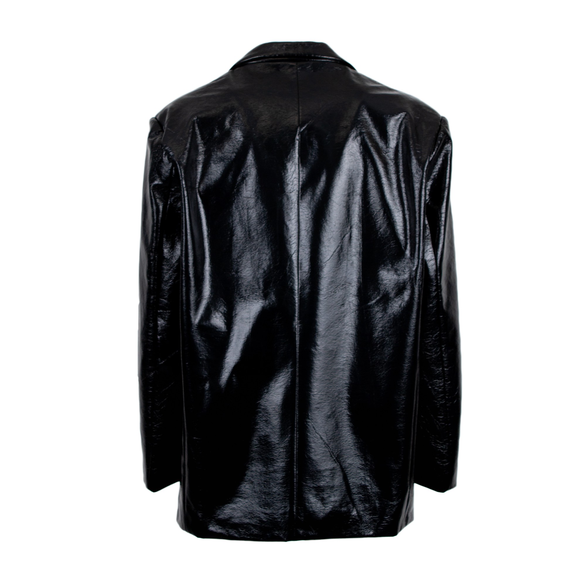 Blazer in ecopelle con scollo a revers e maniche lunghe. Chiusura con bottone. Dettaglio di due tasche sul davanti.