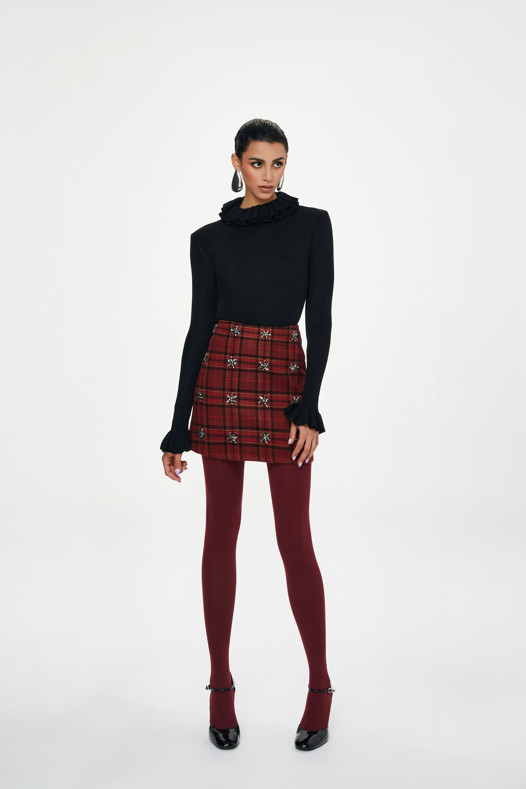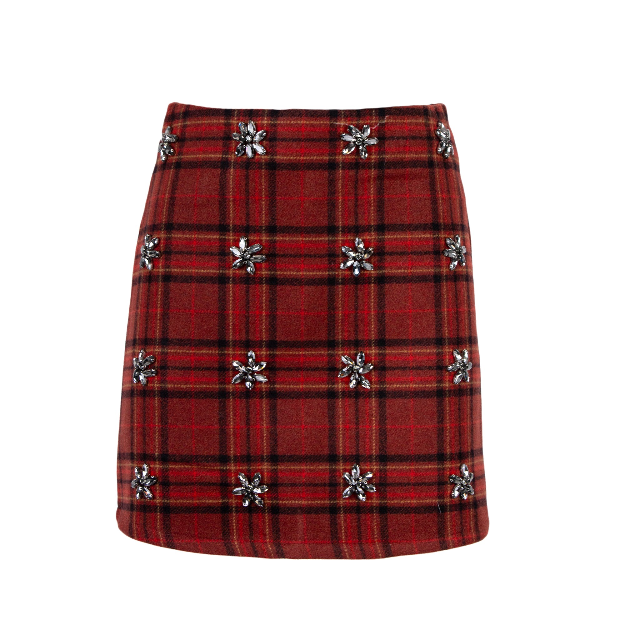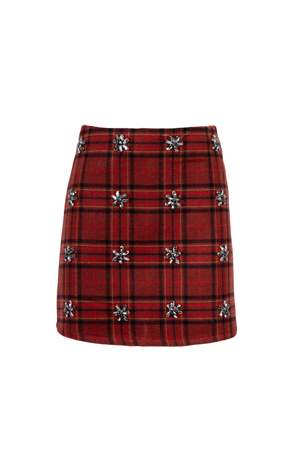 Minigonna a vita alta con fantasia tartan. Dettaglio di decorazione con strass.