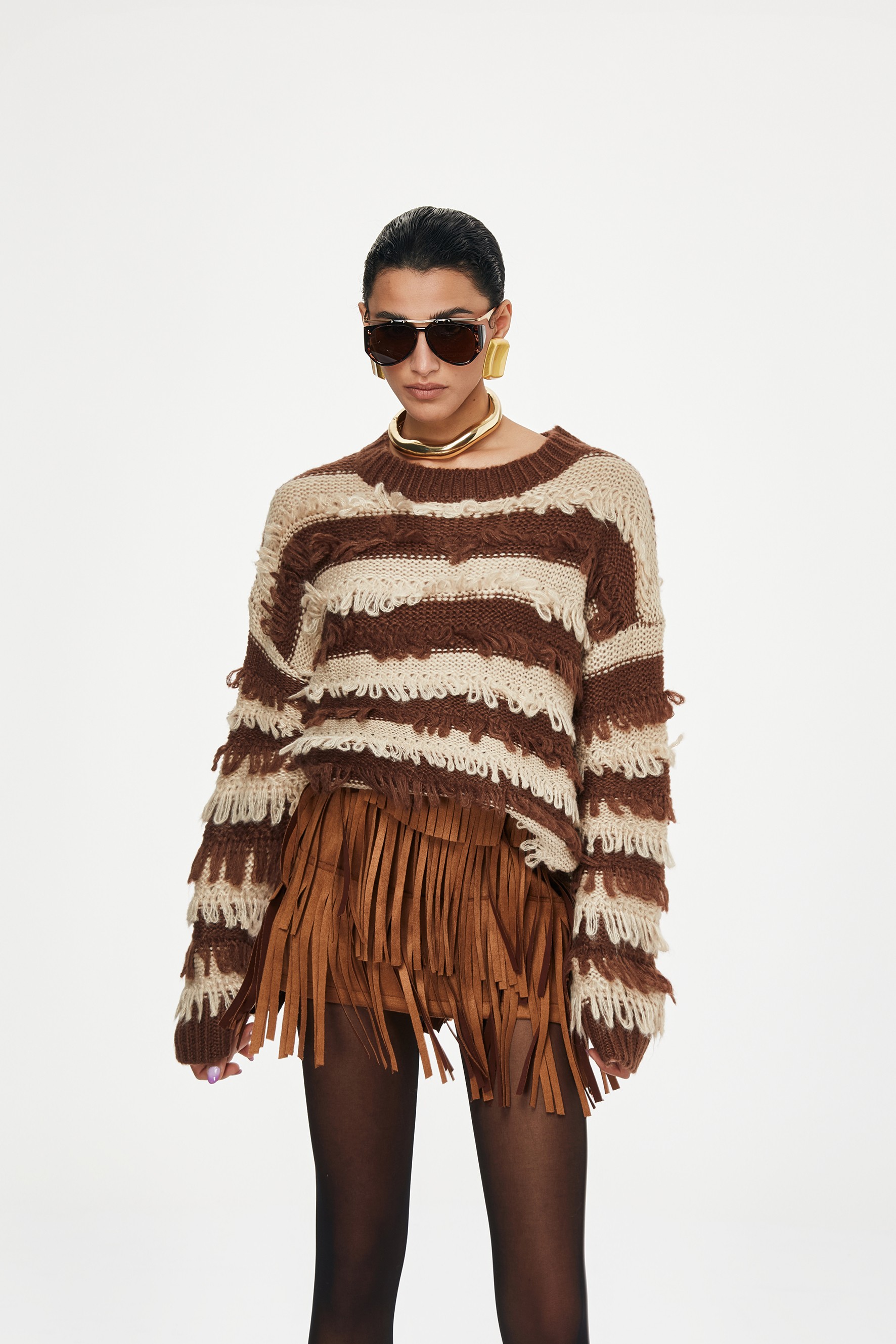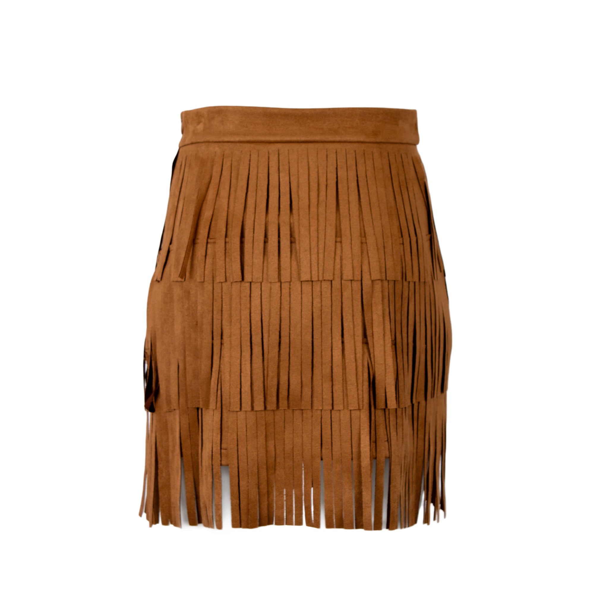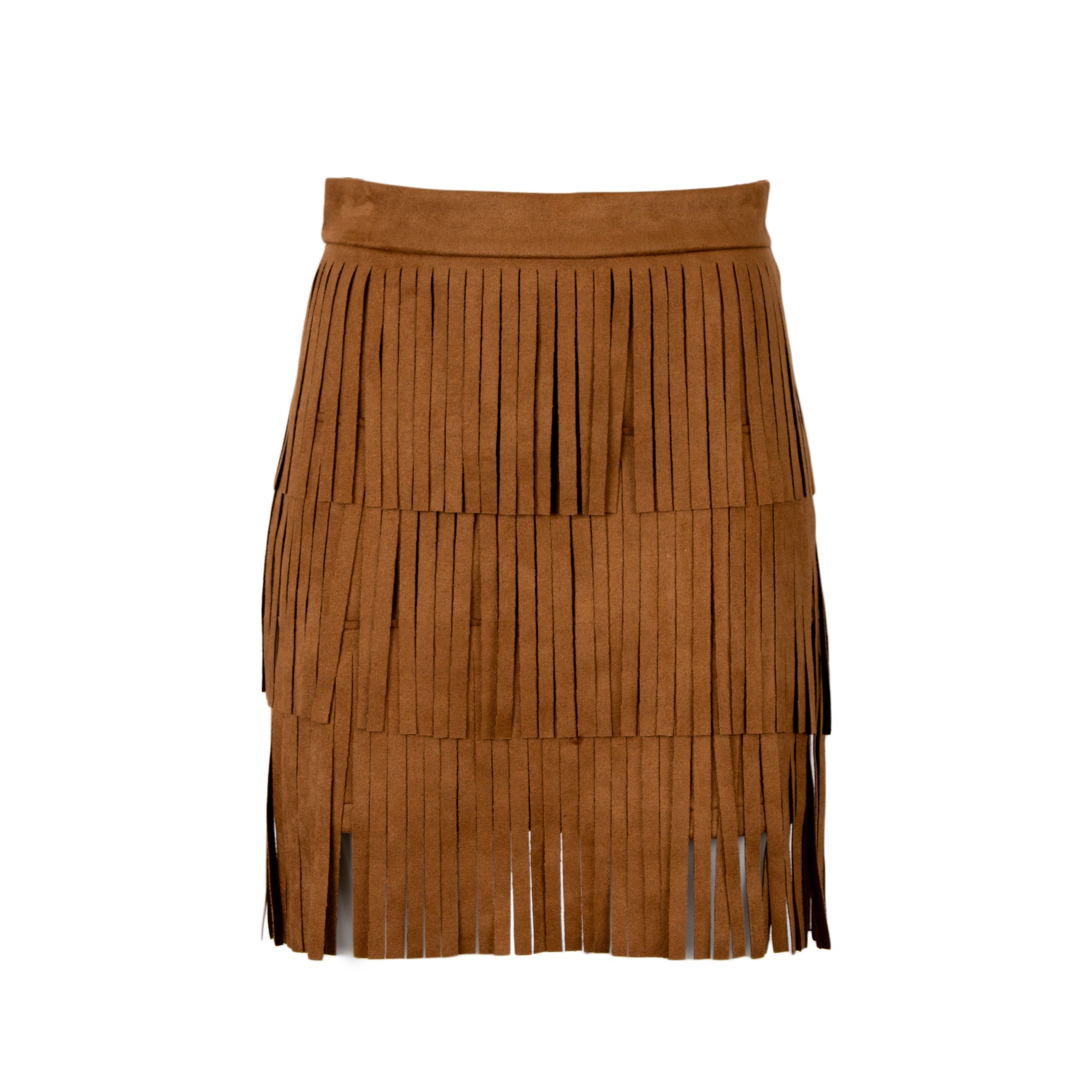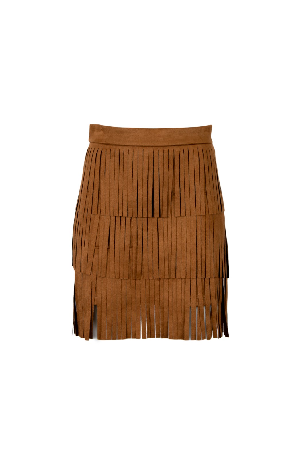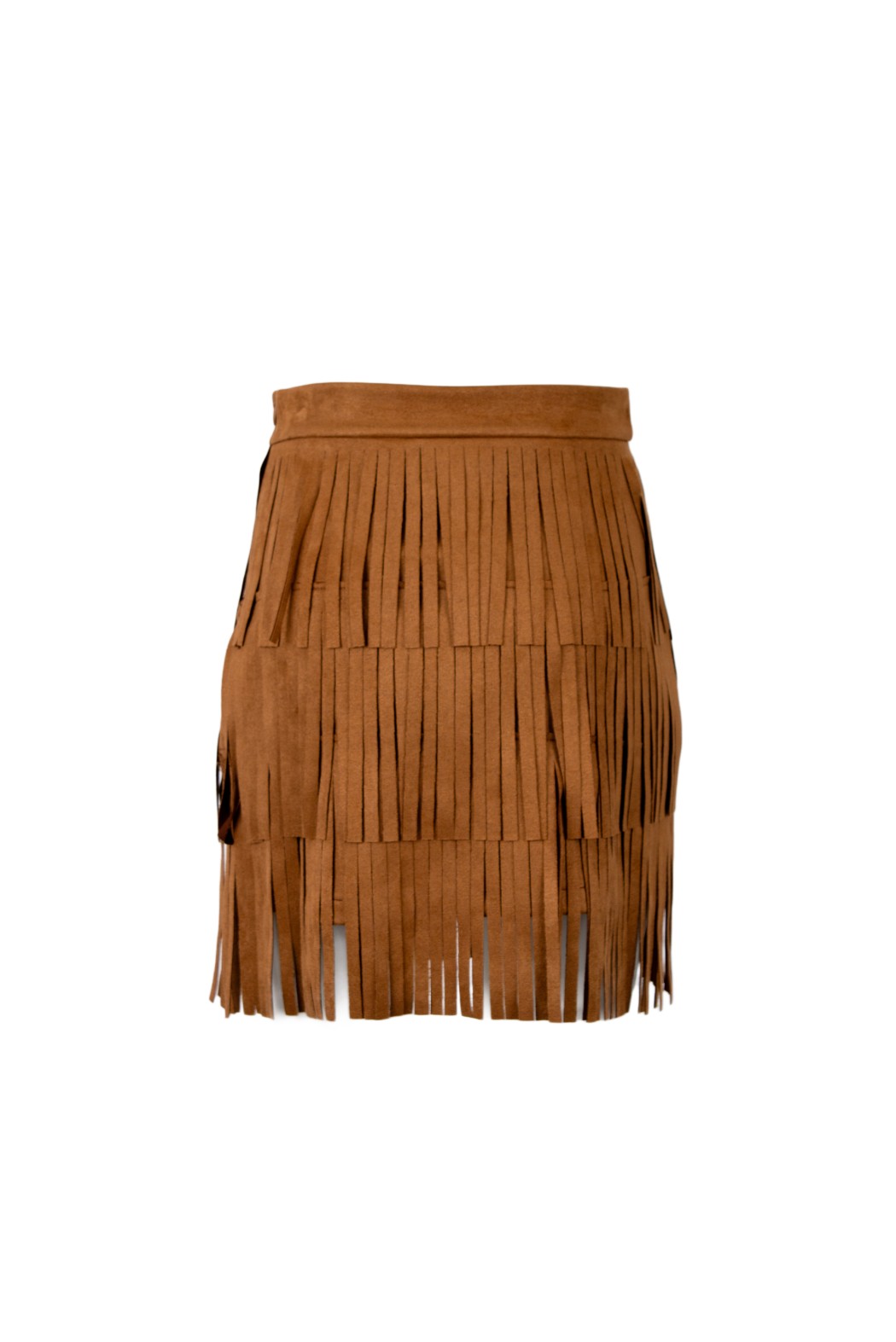 Minigonna a vita alta con lavorazione a frange su tre livelli.