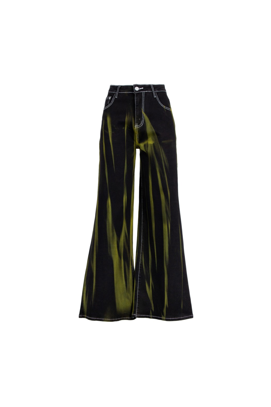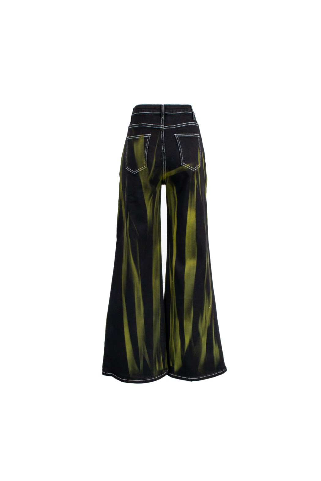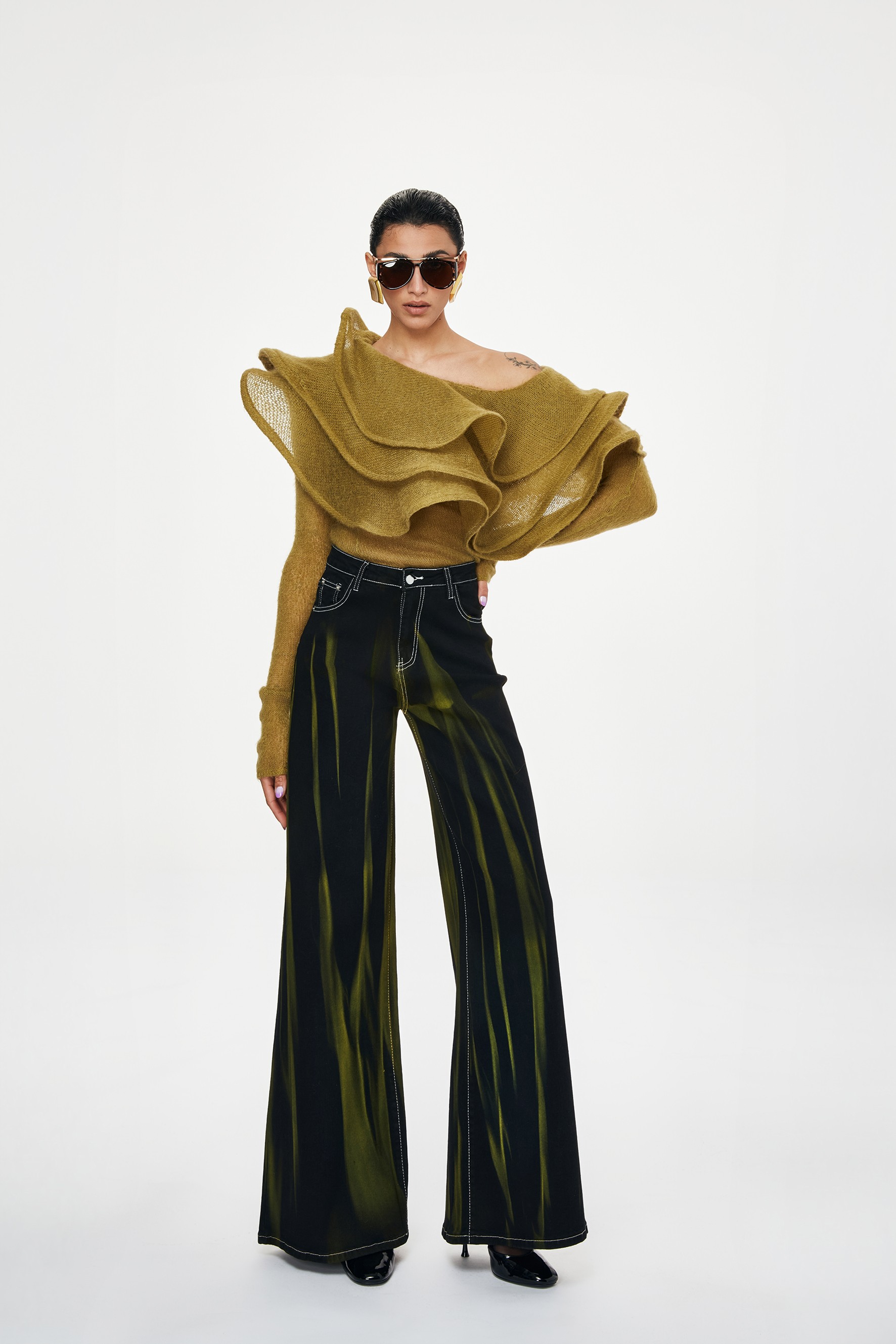 Pantaloni palazzo in velluto. Modello a vita alta con gamba ampia. Motivo astratto con effetto cangiante. Cuciture a contrasto e tasche oblique. Chiusura frontale con zip e bottone.