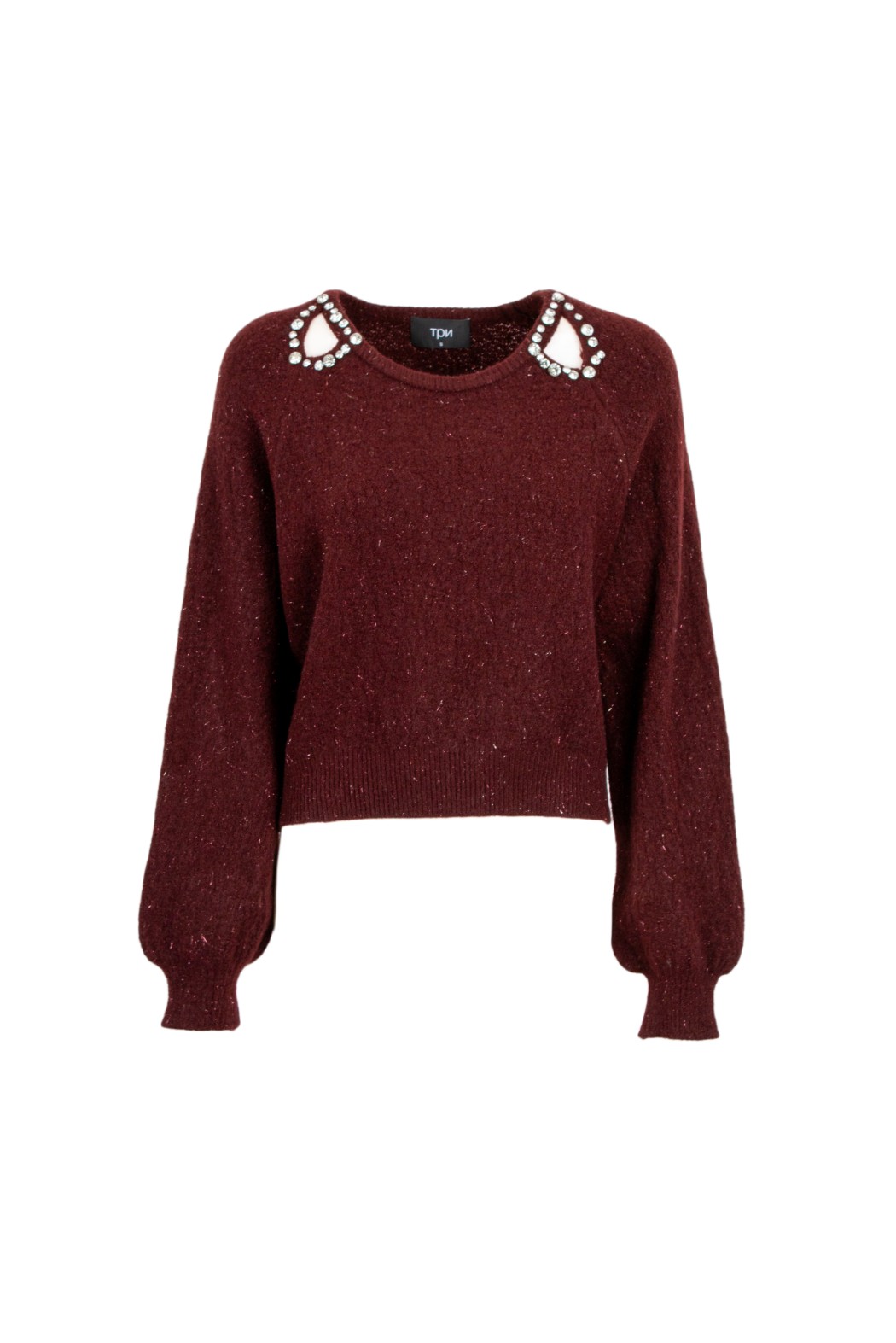Maglione in maglia a girocollo e taglio corto. Decorazione di fiocchi con strass sul collo. Maniche a palloncino con polsino stretto.
