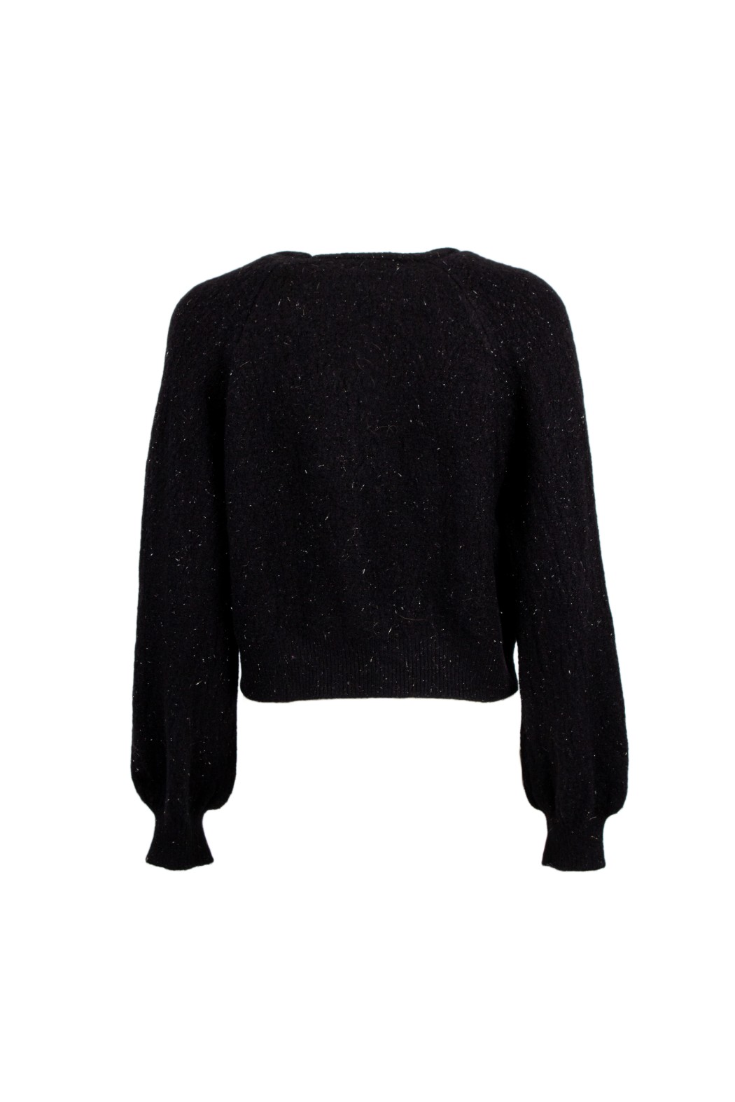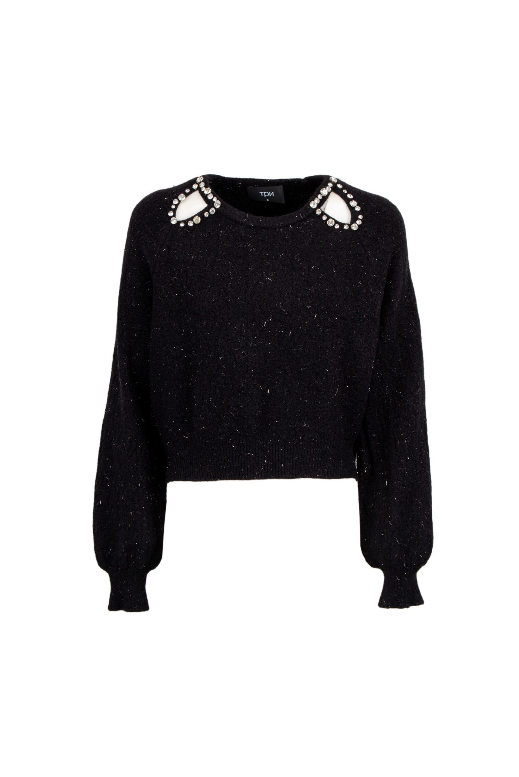 Maglione in maglia a girocollo e taglio corto. Decorazione di fiocchi con strass sul collo. Maniche a palloncino con polsino stretto.