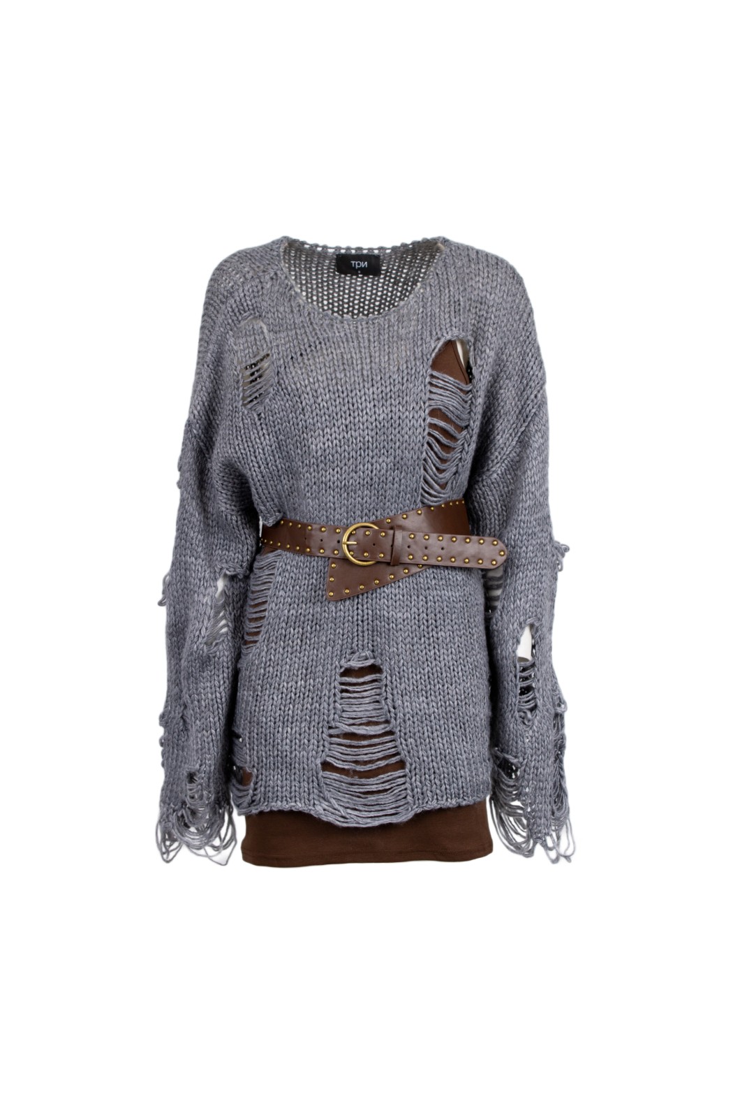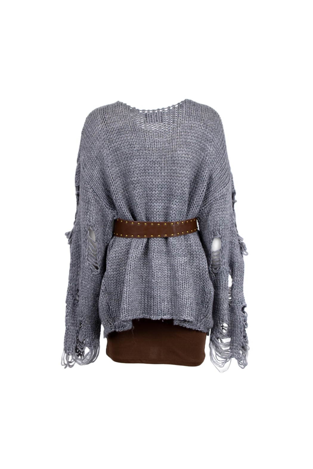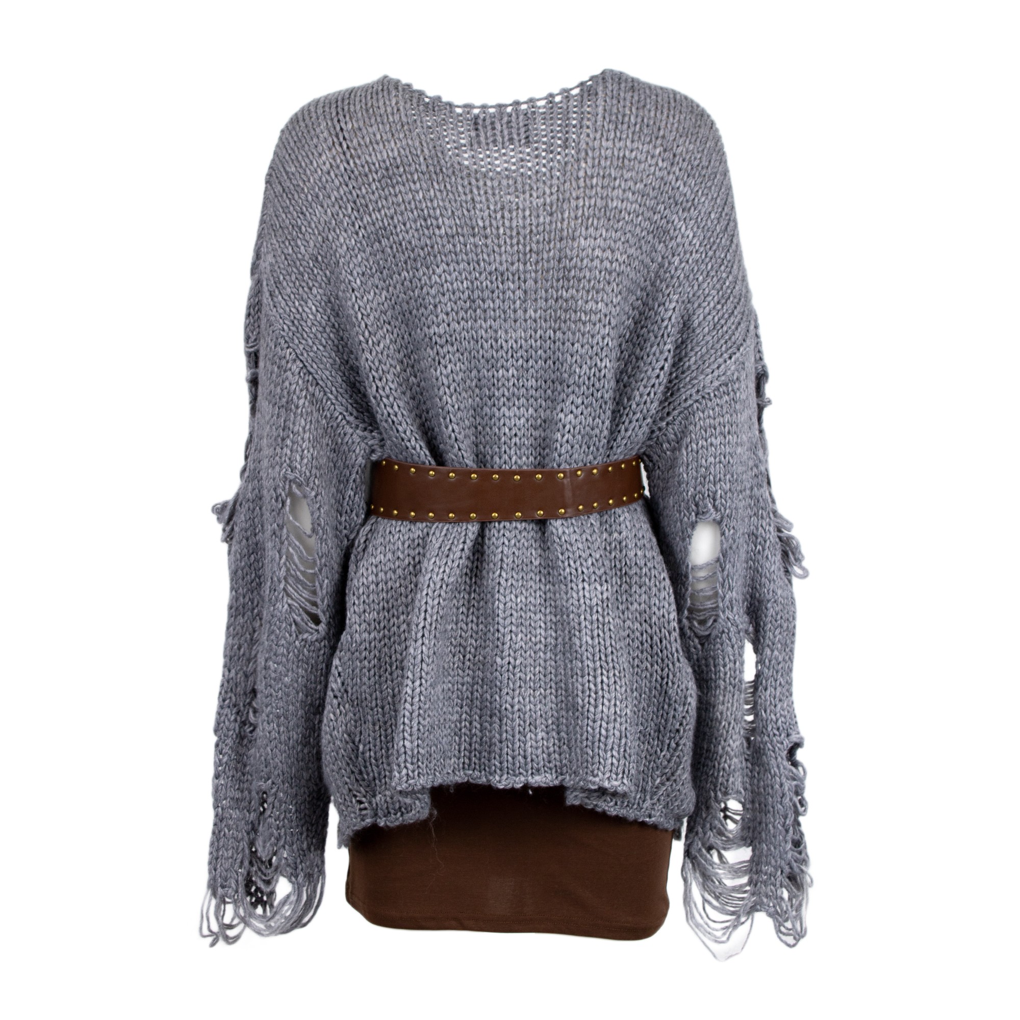 Maglione in maglia a girocollo. Dettaglio di strappi. Cintura con borchie in vita.