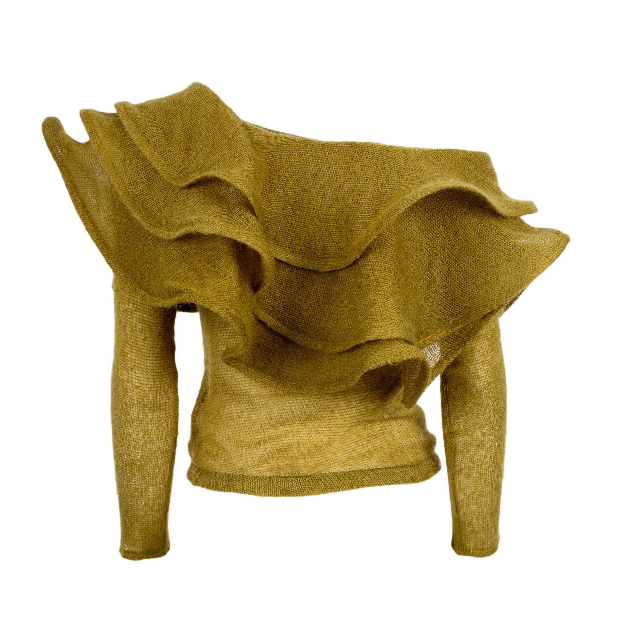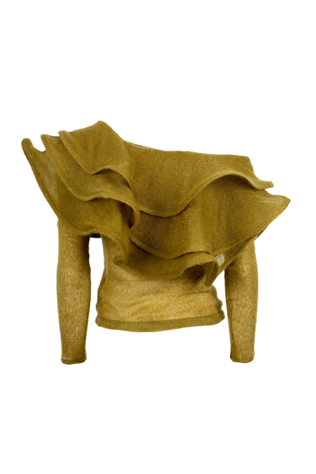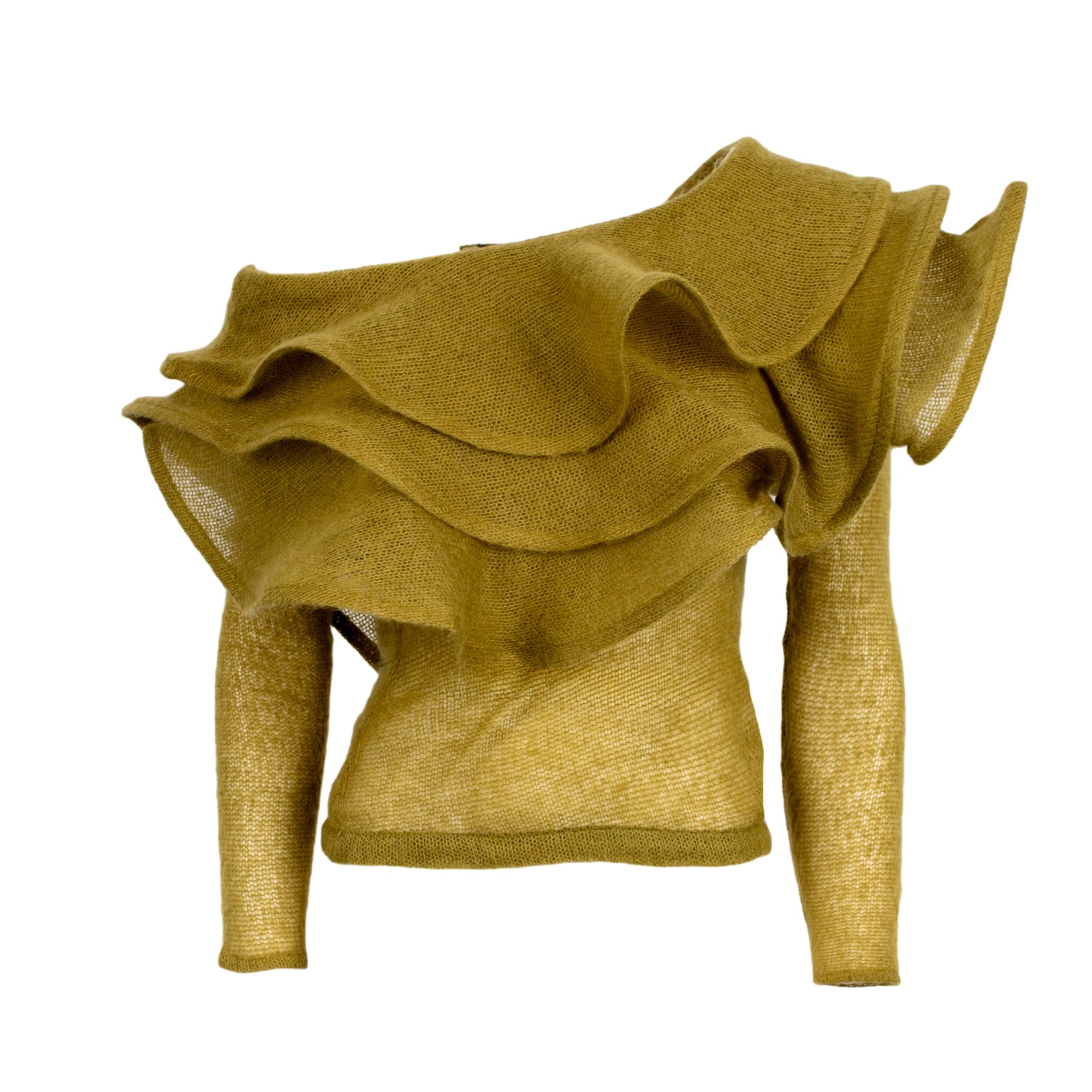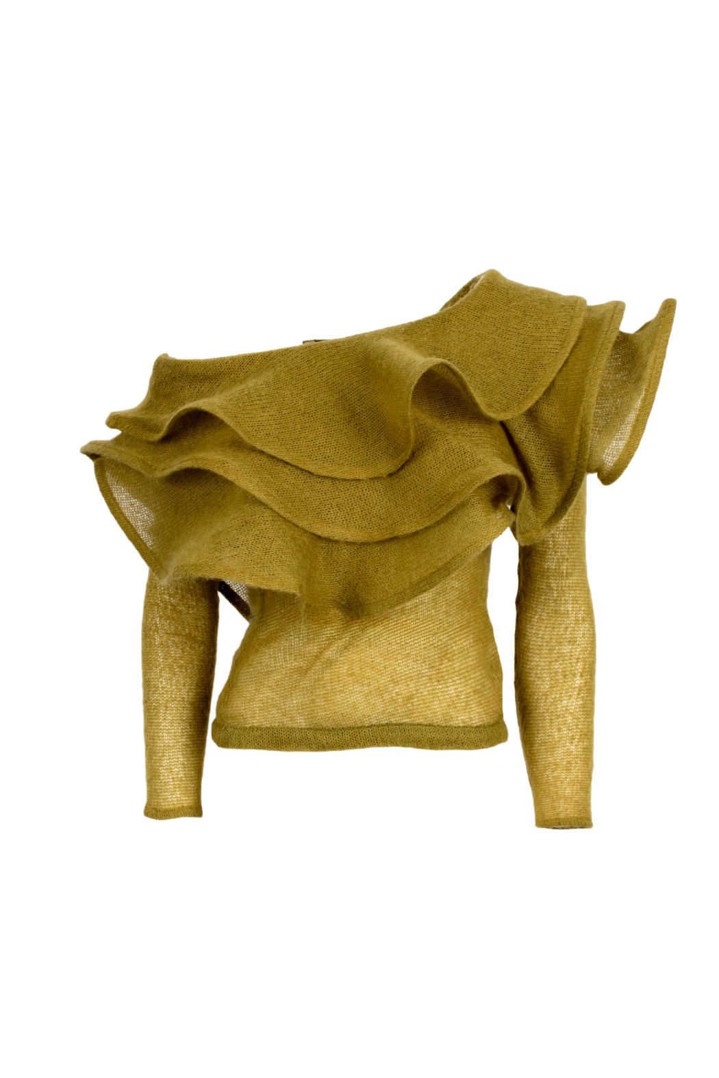 Camicia a maniche lunghe con spalla scoperta. Scollo asimmetrico. Dettaglio di maxi ruches.