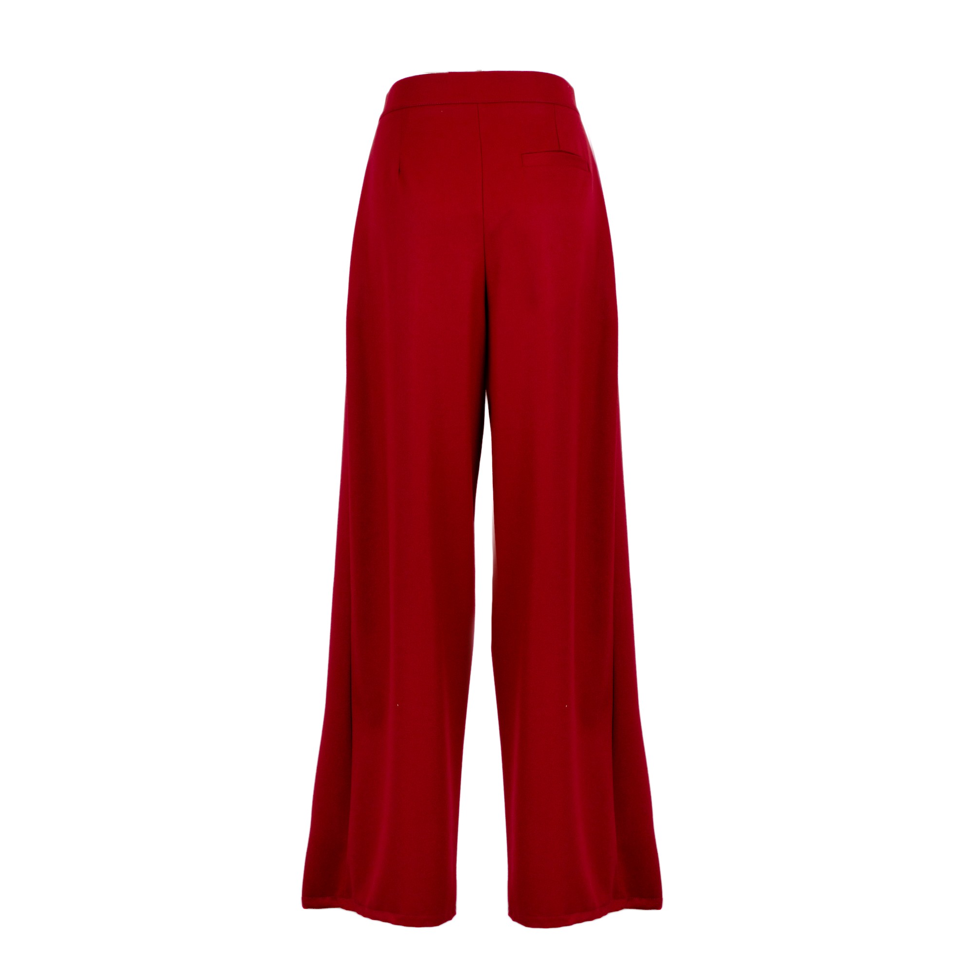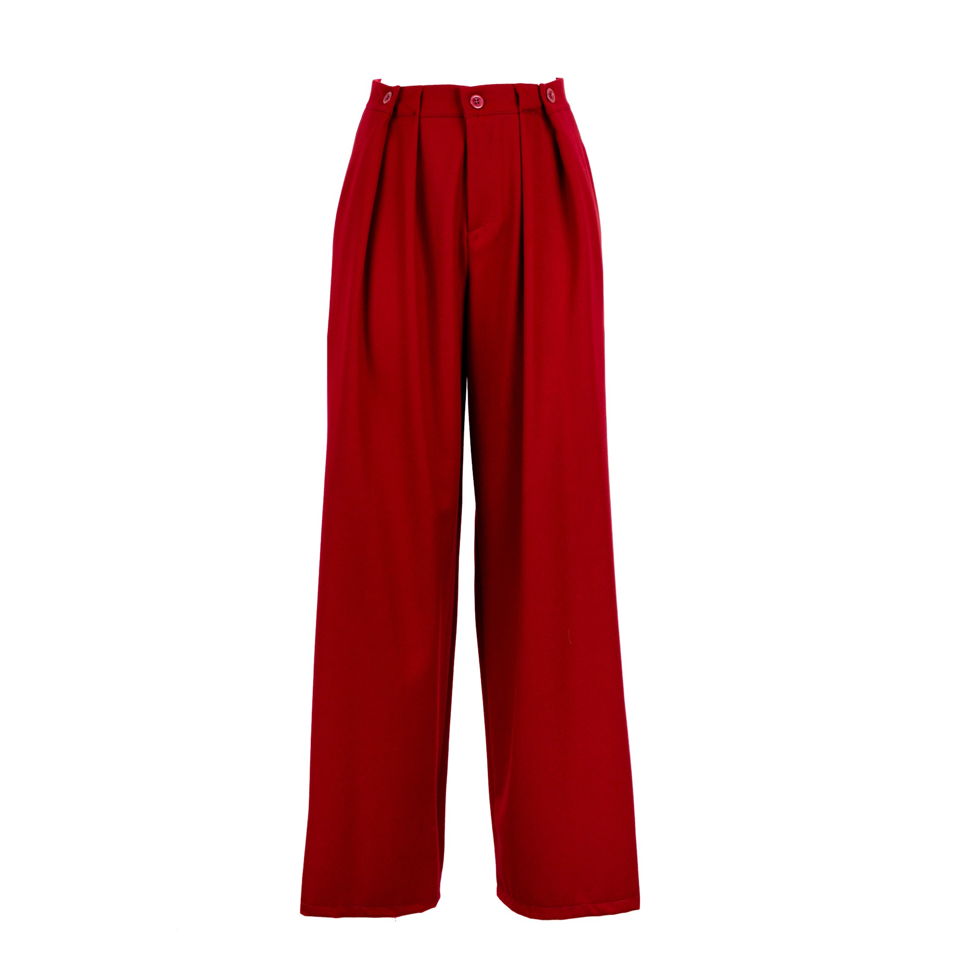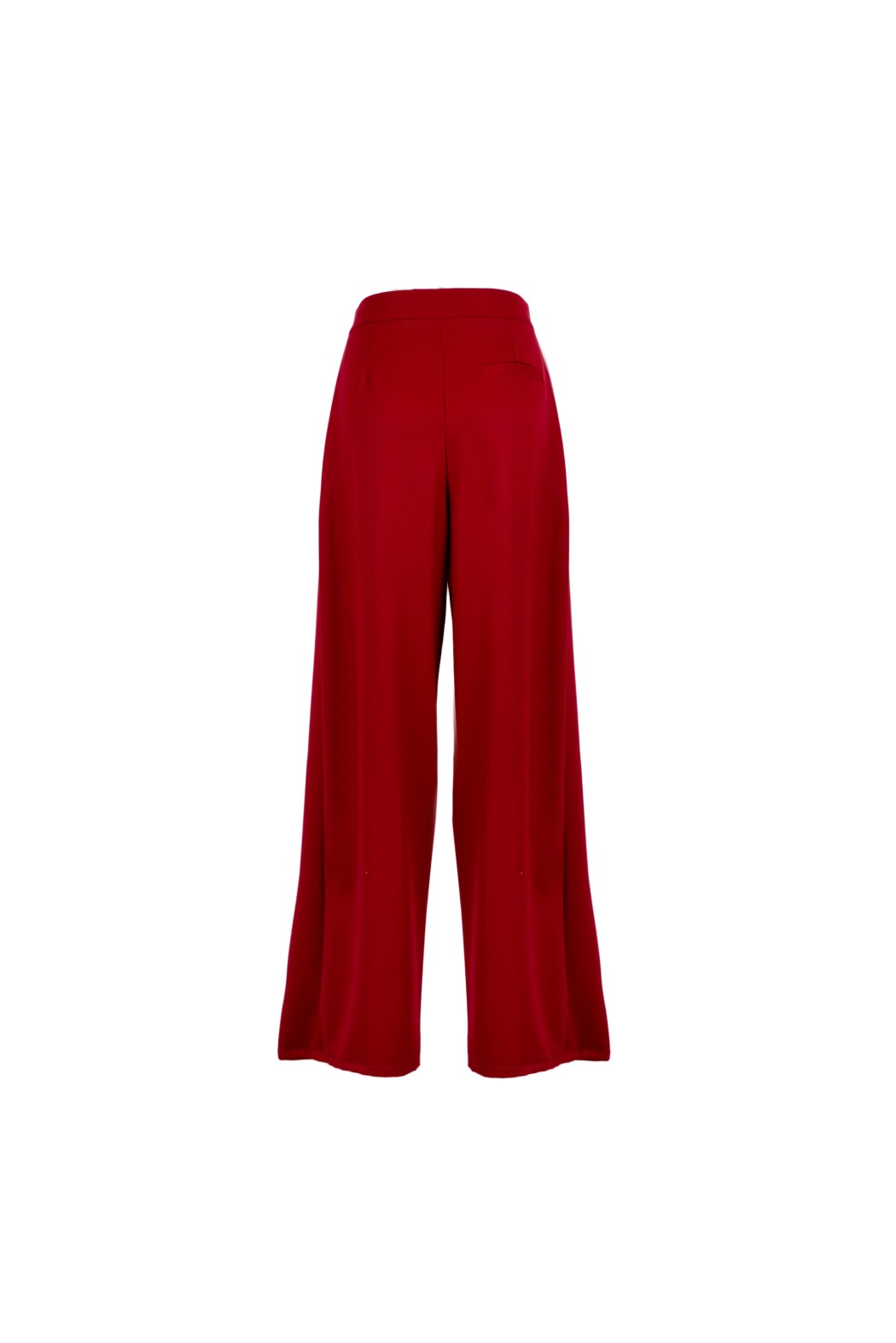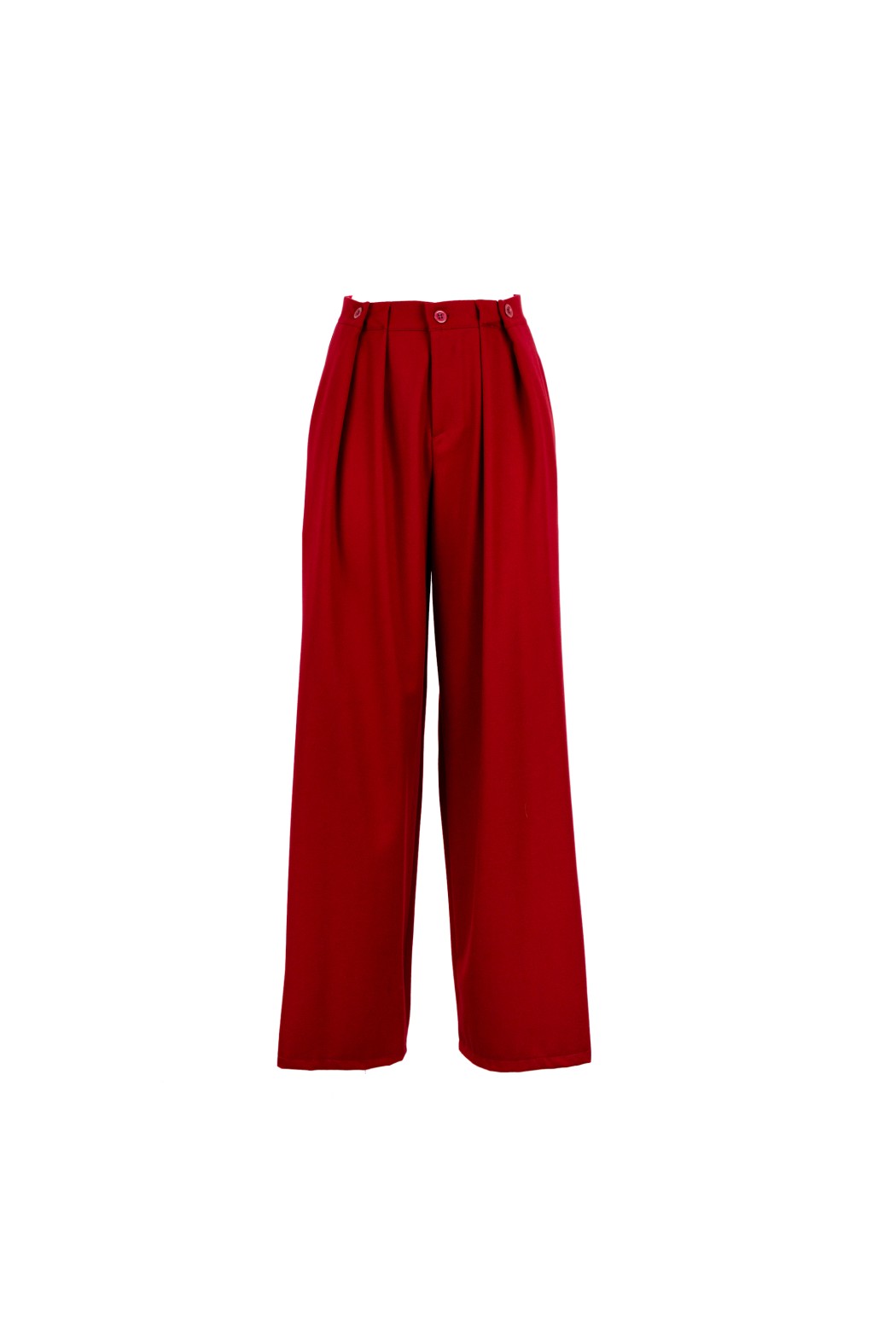 Pantalone a vita alta con gamba ampia. Dettaglio di due bottoni in vita.
