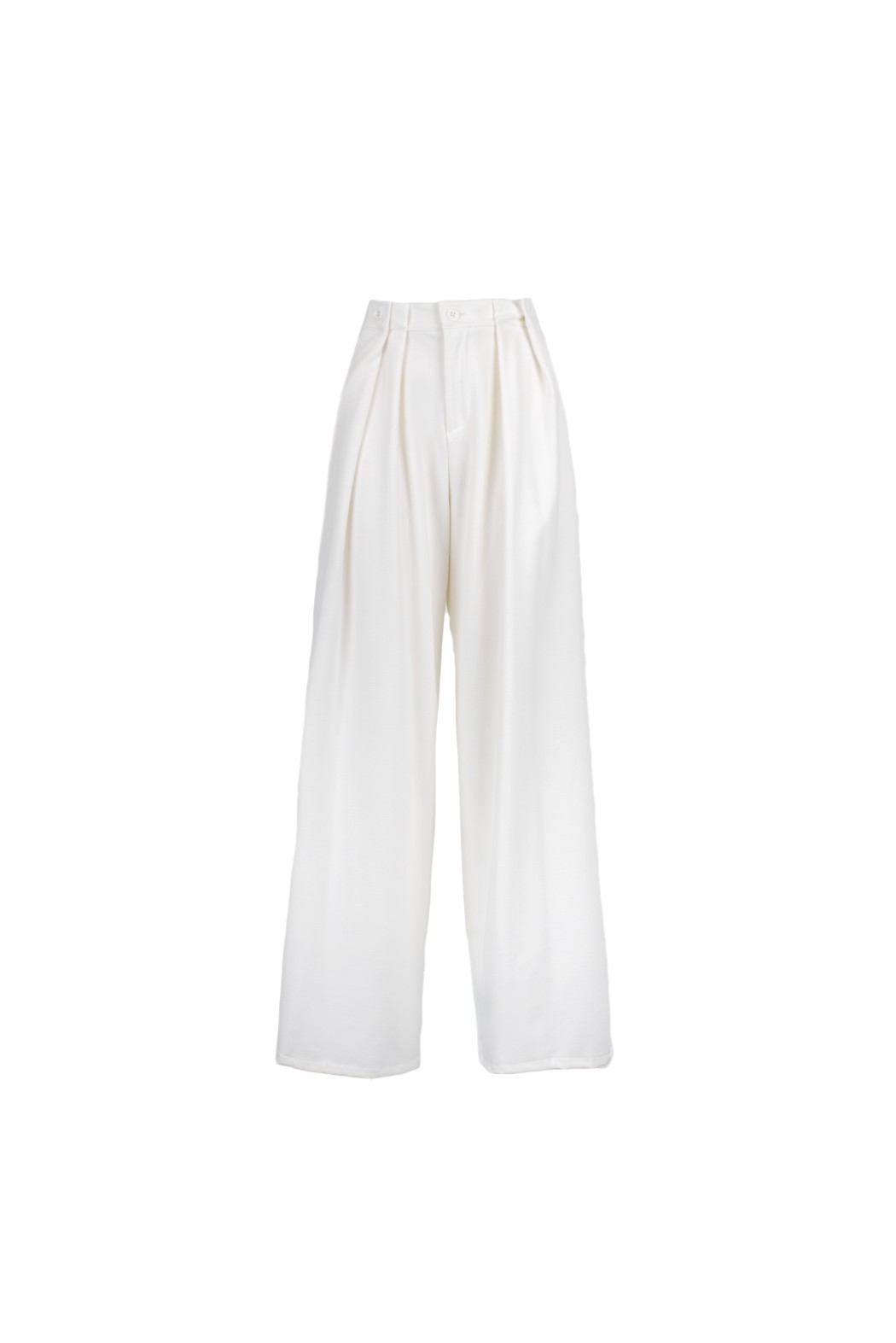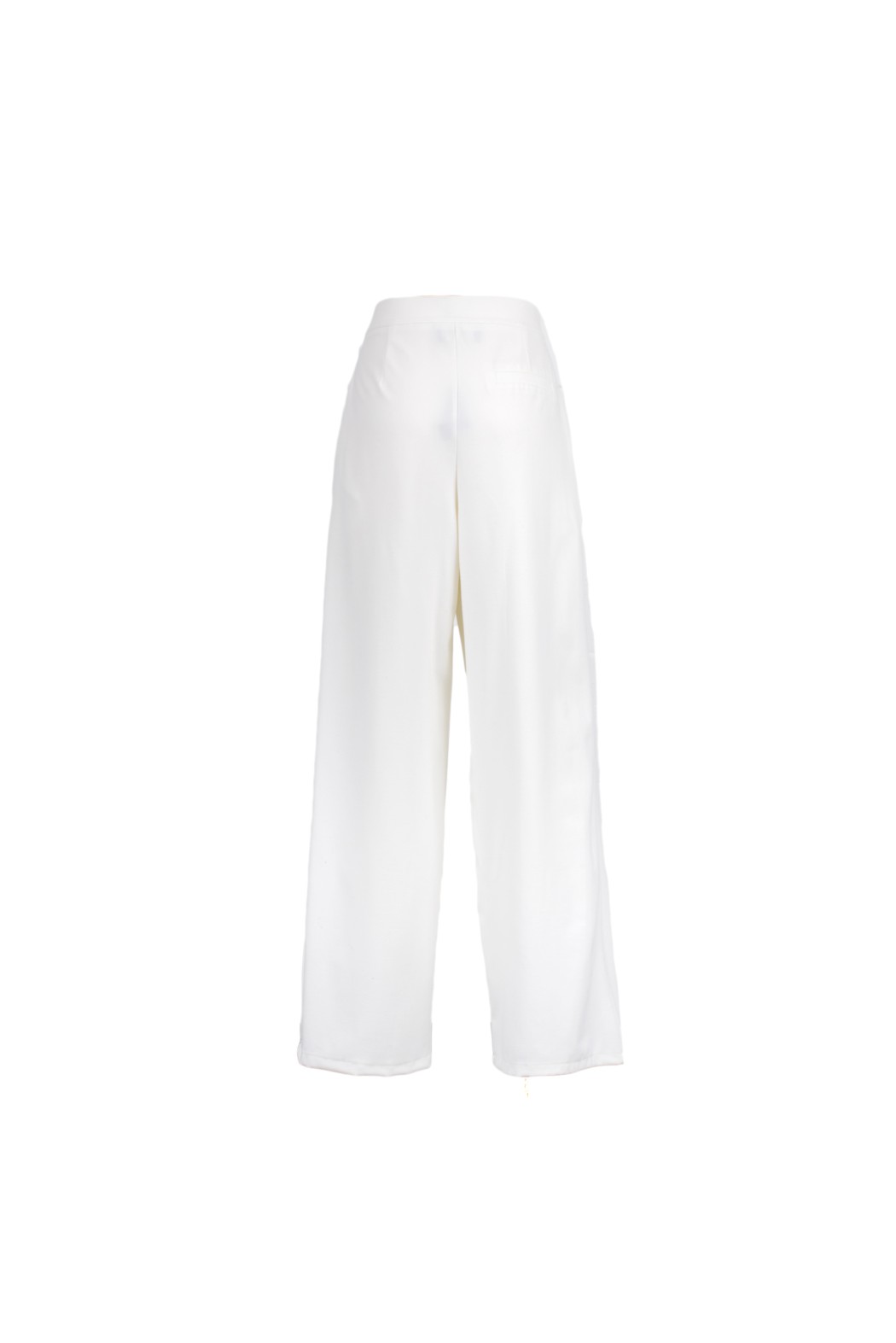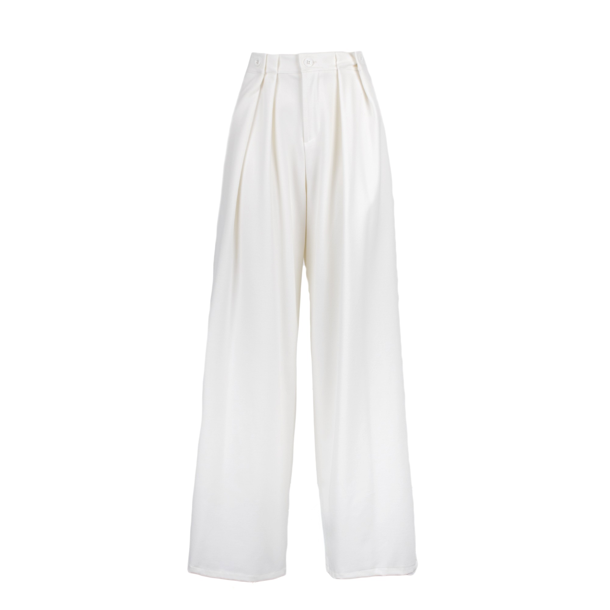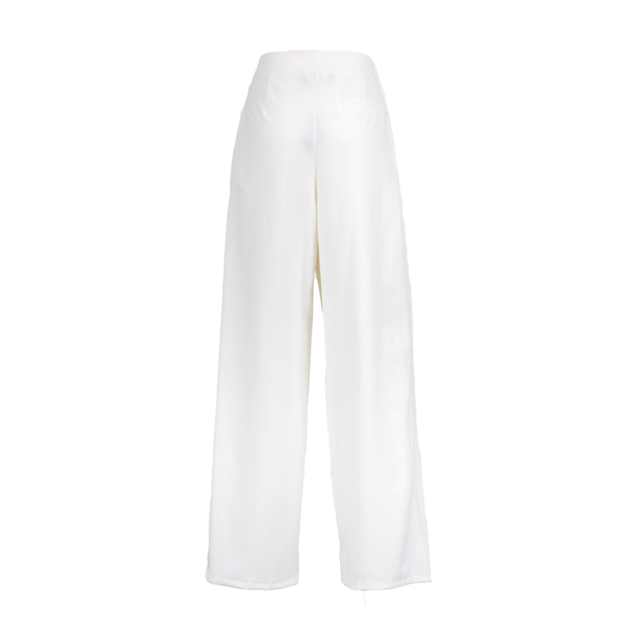Pantalone a vita alta con gamba ampia. Dettaglio di due bottoni in vita.