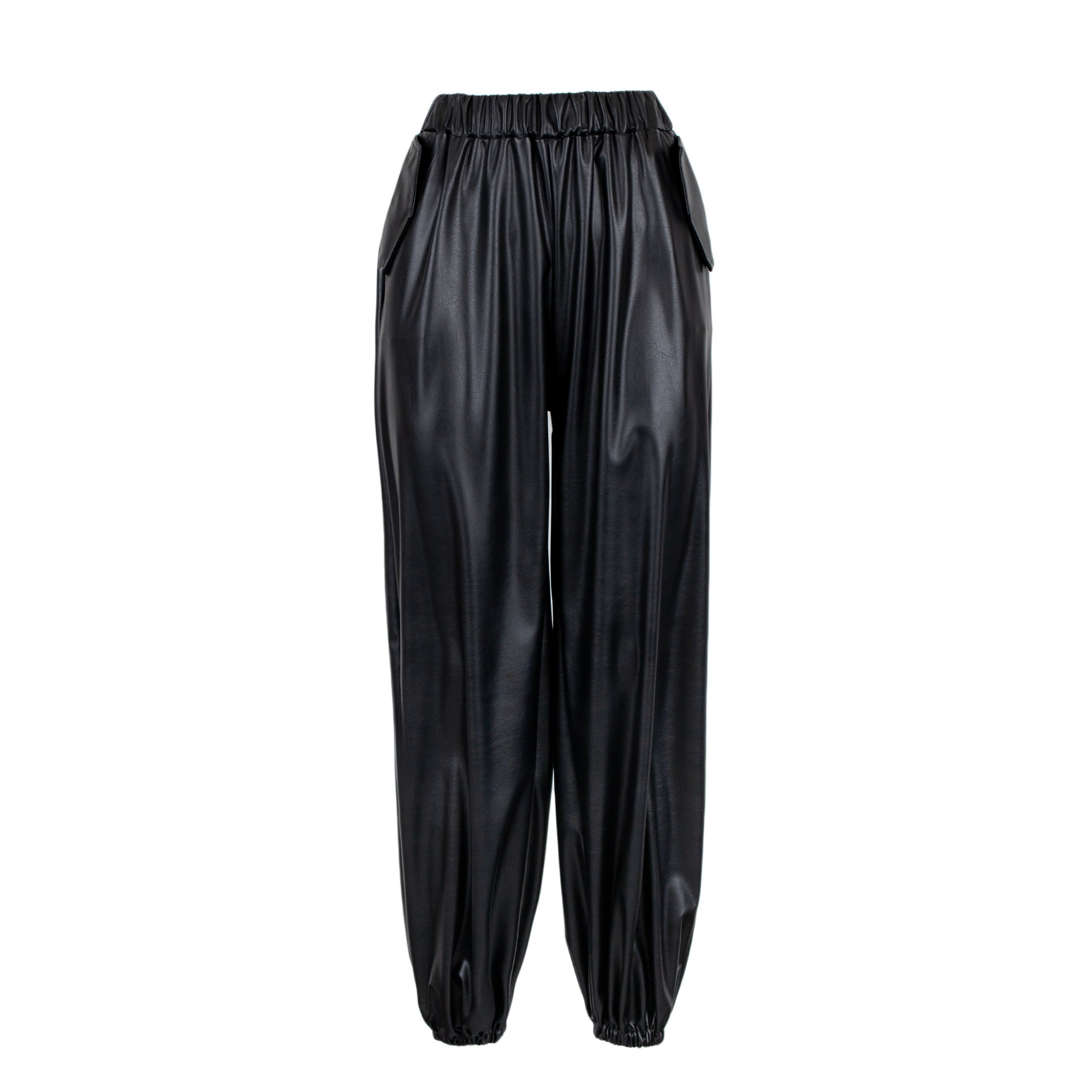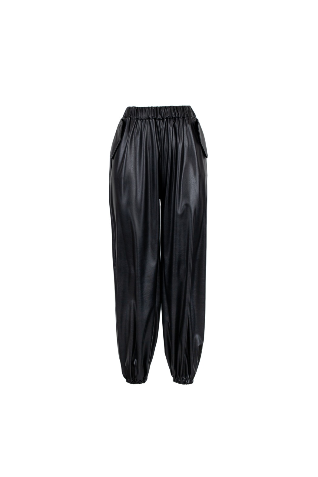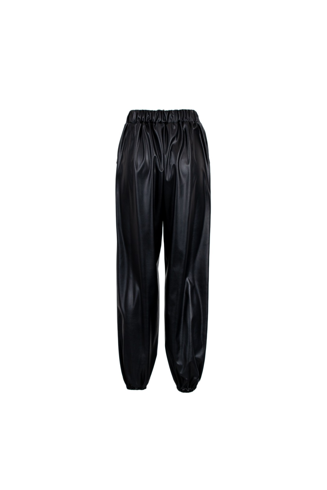 Pantalone jogger con vita elasticizzata. Dettaglio di due tasche laterali e coulisse alle caviglie.