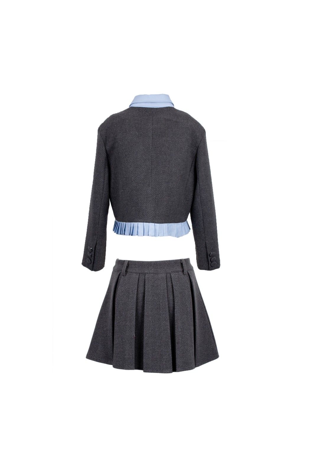 Giacca corta a maniche lunghe. Colletto a contrasto con laccetti. Chiusura con bottoni. Dettaglio di due taschini applicati e arricciatura sul fondo.