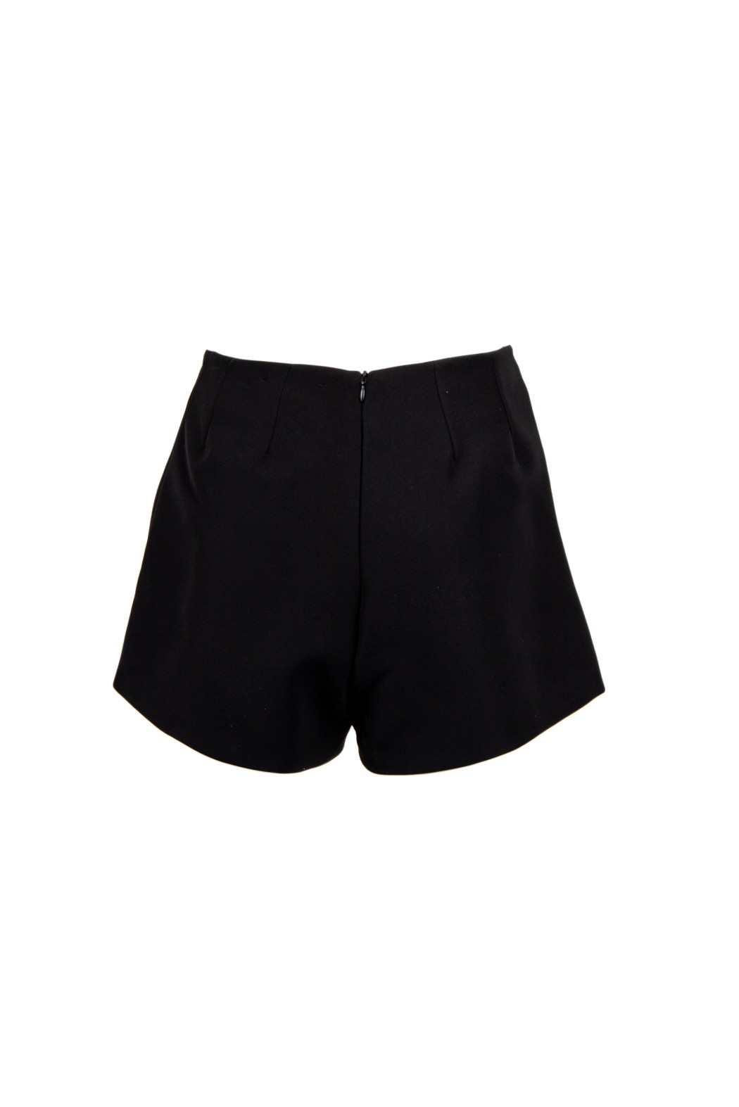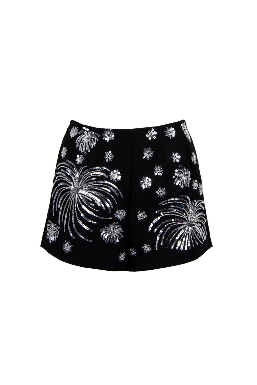 Shorts a vita alta. Modello a gamba ampia. Decorazione con paillettes argentate ricamate a forma di fuochi d'artificio.