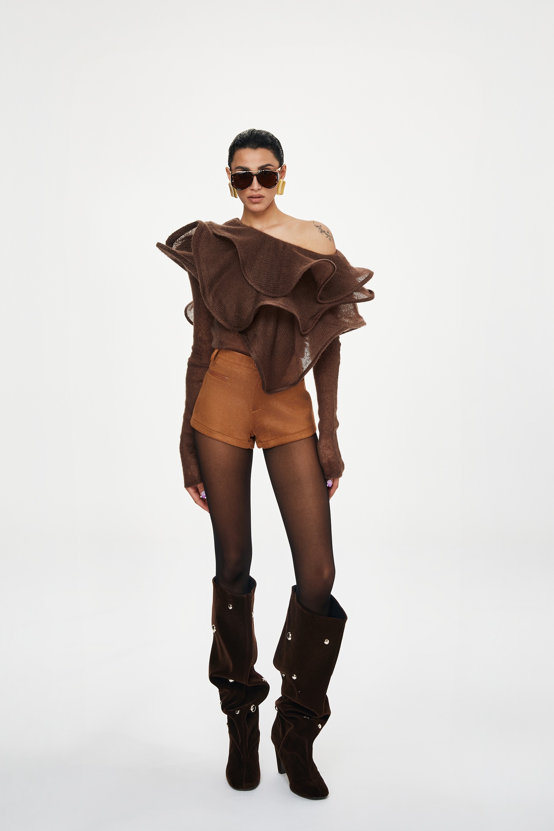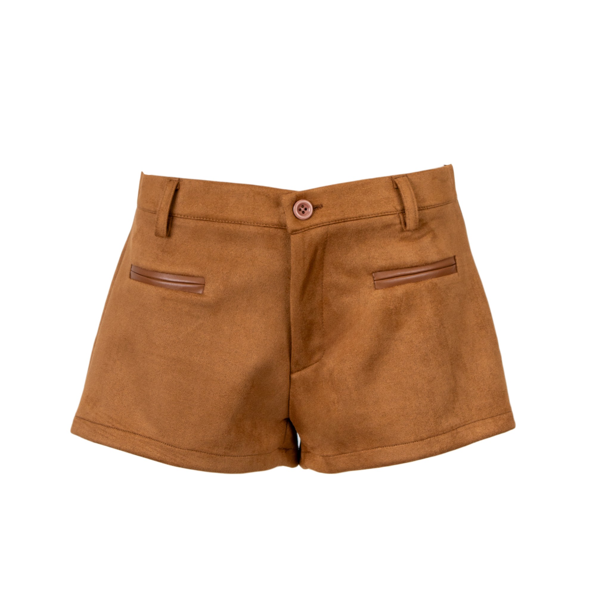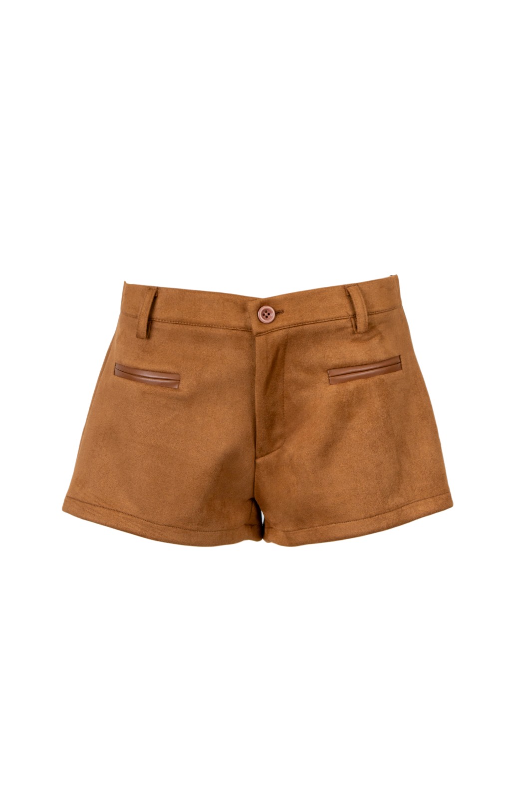 Shorts a vita alta con gamba ampia. Dettaglio di due tasche finte sul davanti. Chiusura con bottone.