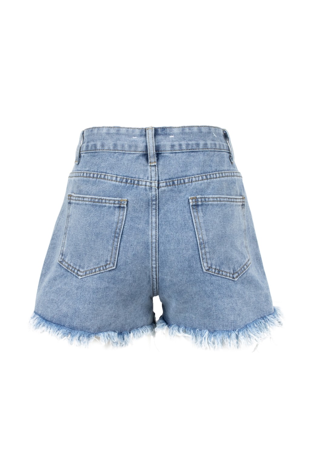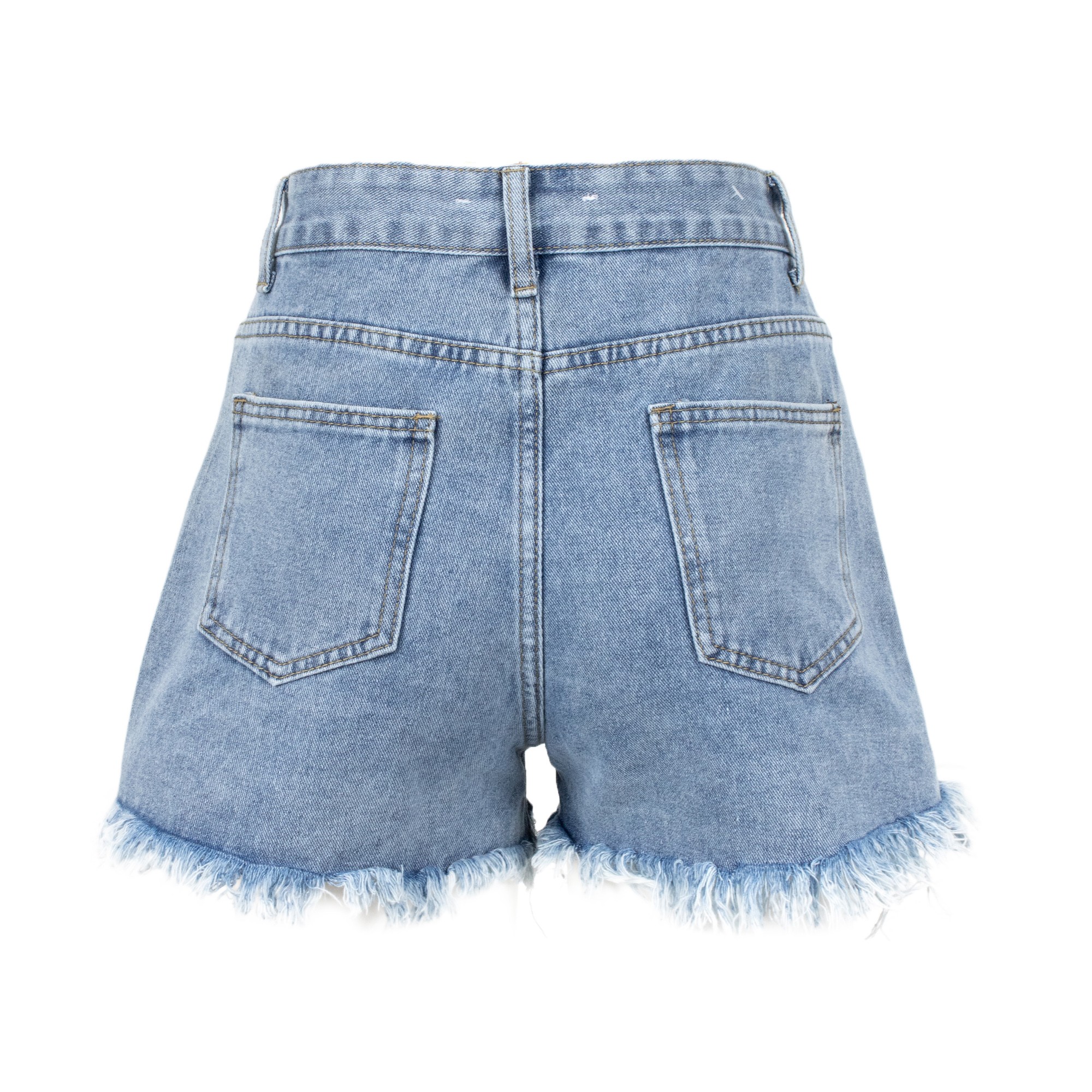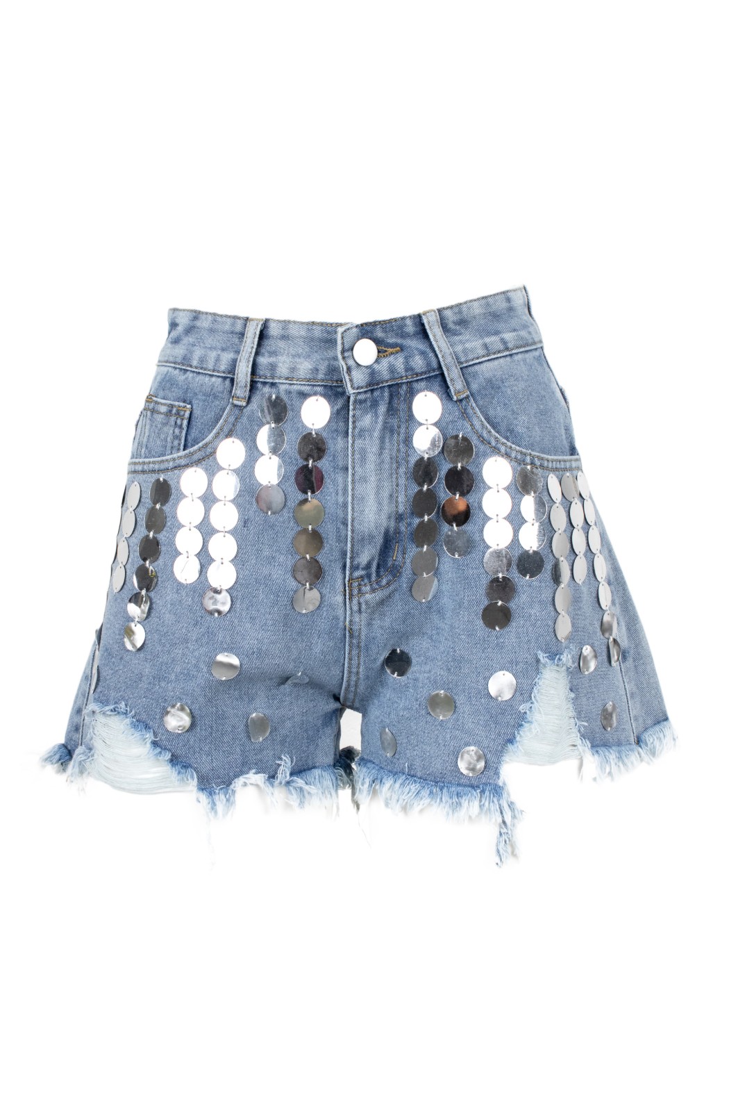 Shorts denim, sfrangiature ai bordi e applicazioni riflettenti sul fronte..
