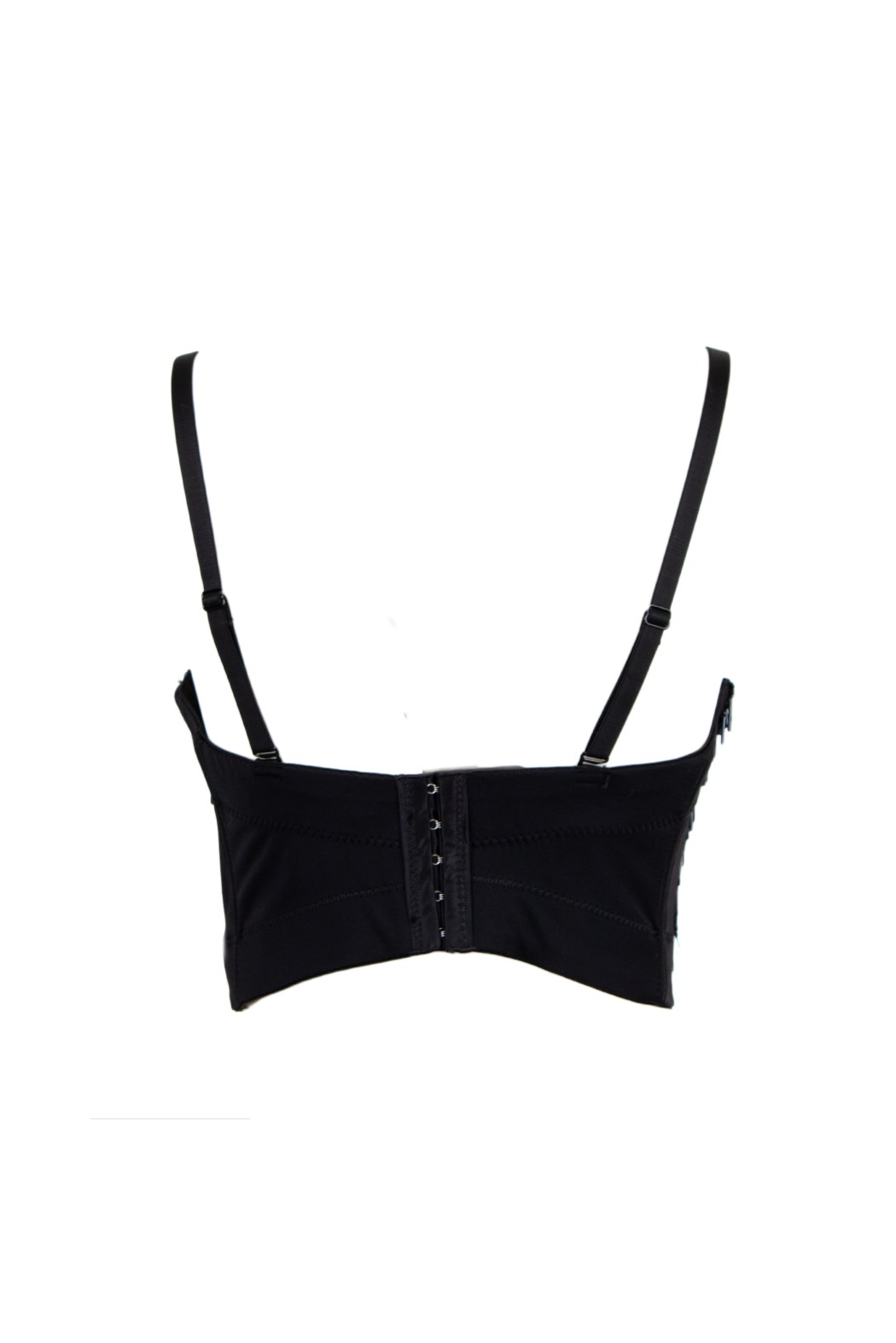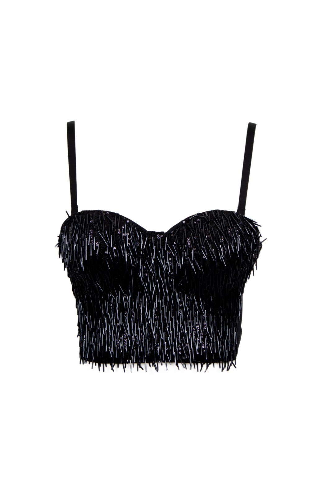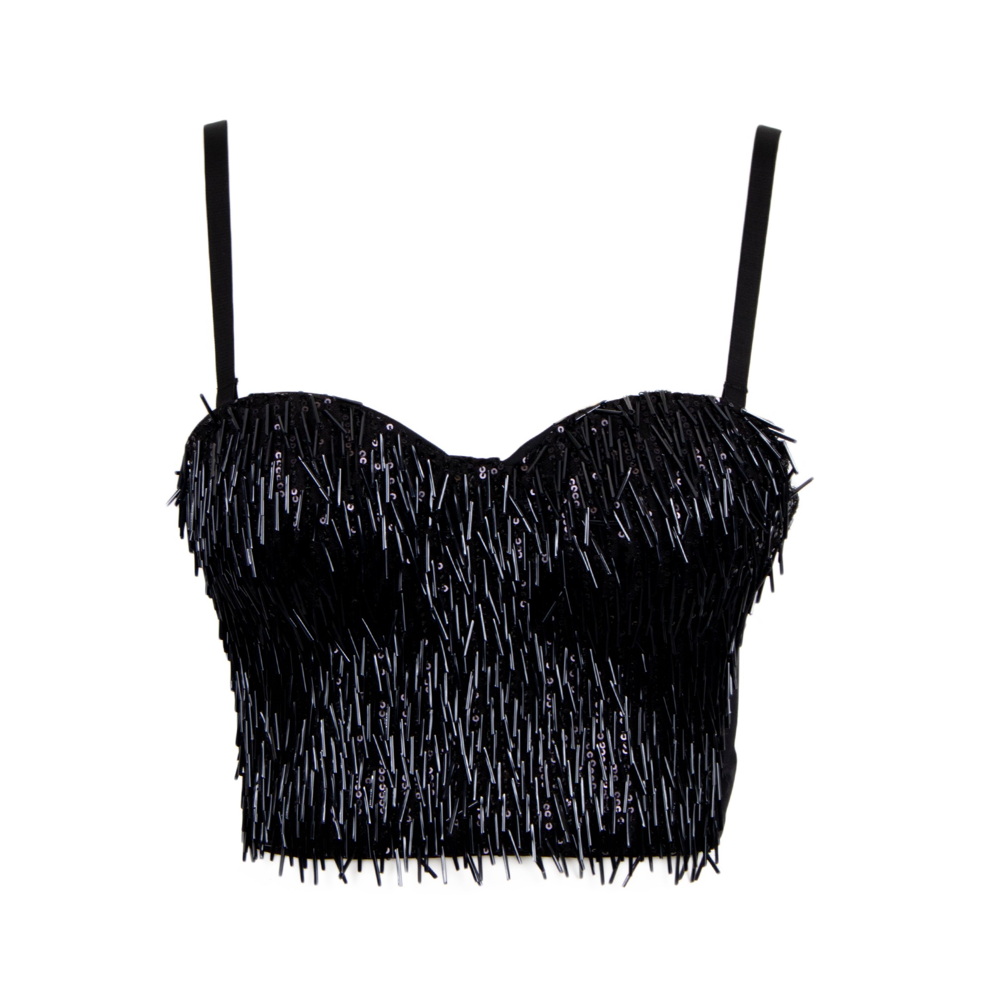 Top corto a fascia. Modello senza spalline con scollo a cuore e spalline sottili. Interamente decorato con frange di perline e paillettes.
