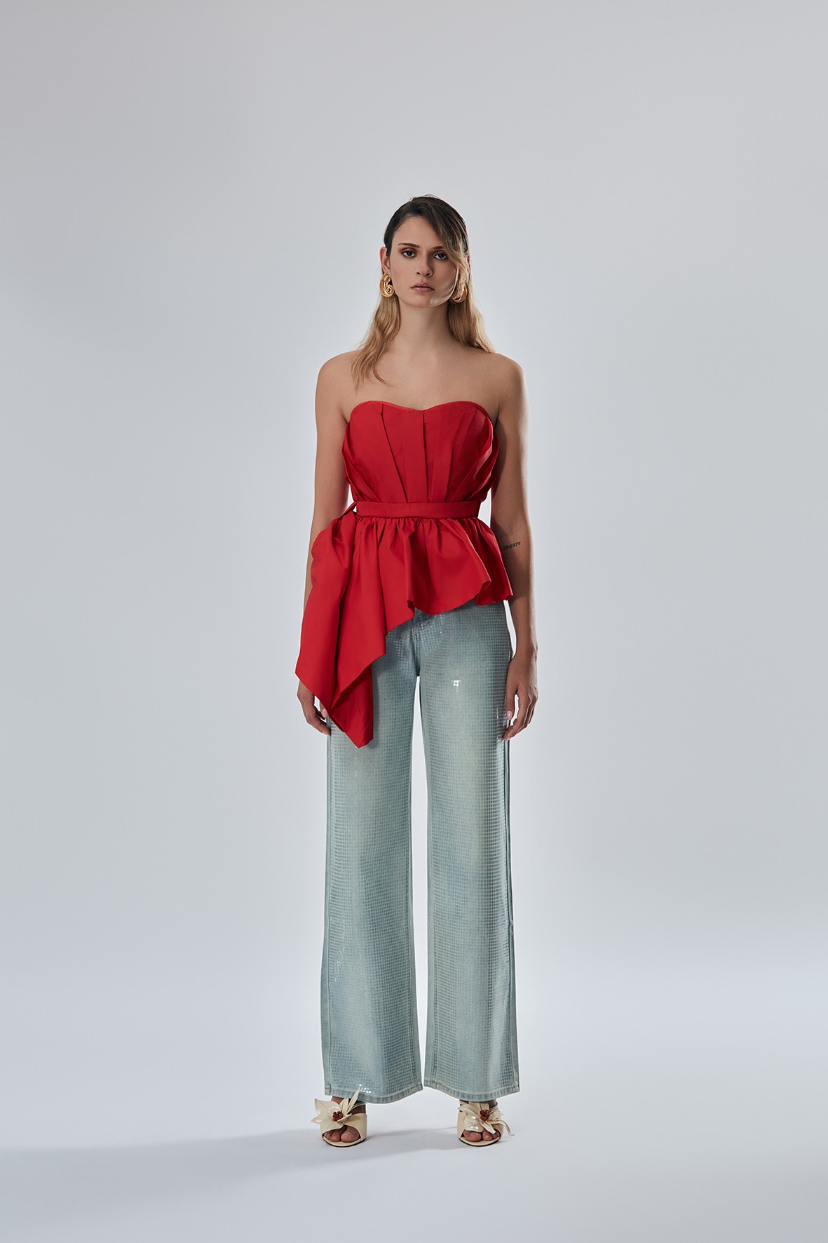 Top mini scollo dritto, asimmetrico drappeggiato in vita.