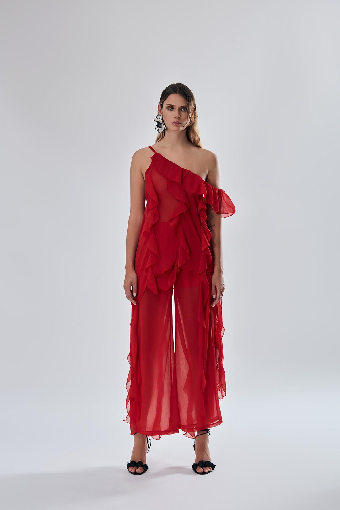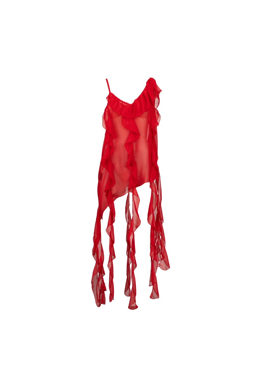 Top scollo profondo, con lunghe rouches.
